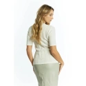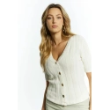Ažurový dámský svetr z příjemné viskózy. Svetr s krátkými rukávy a výstřihem do V. Svetr se zapíná na knoflíky. Tento model bude ideální pro každodenní letní styling. Modelka na fotografii měří 177 cm a nosí velikost S.