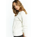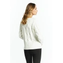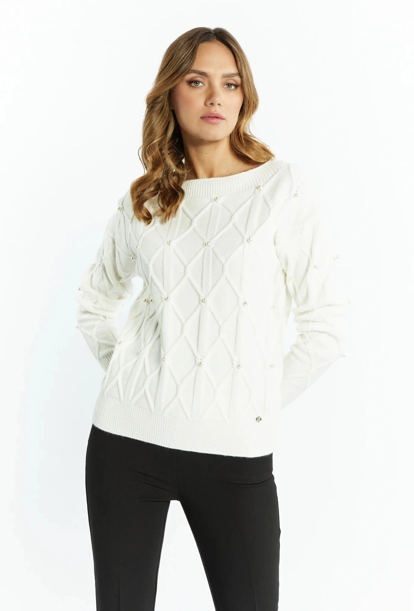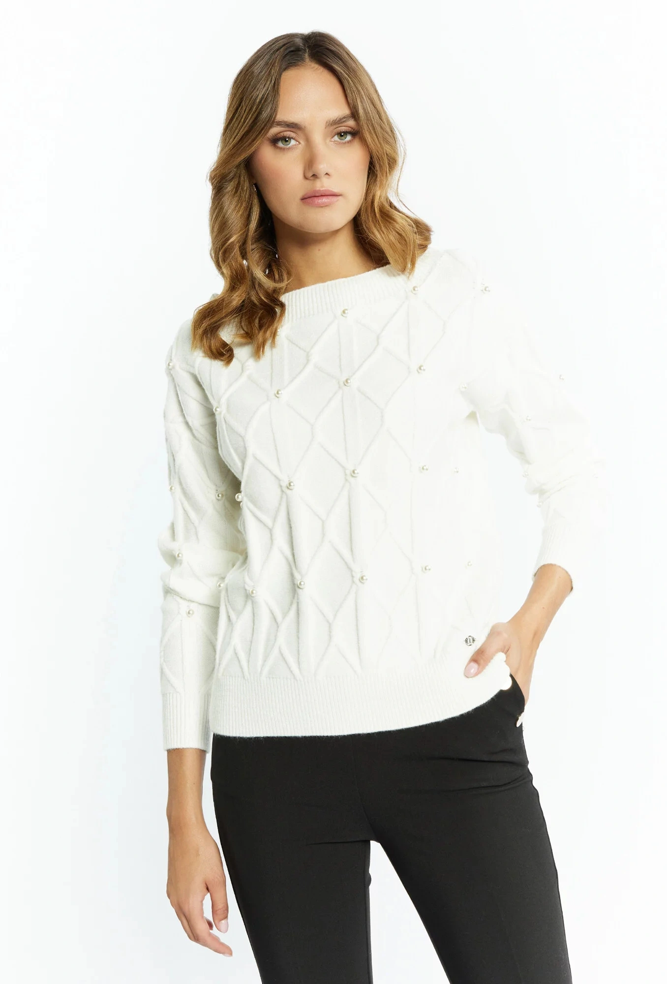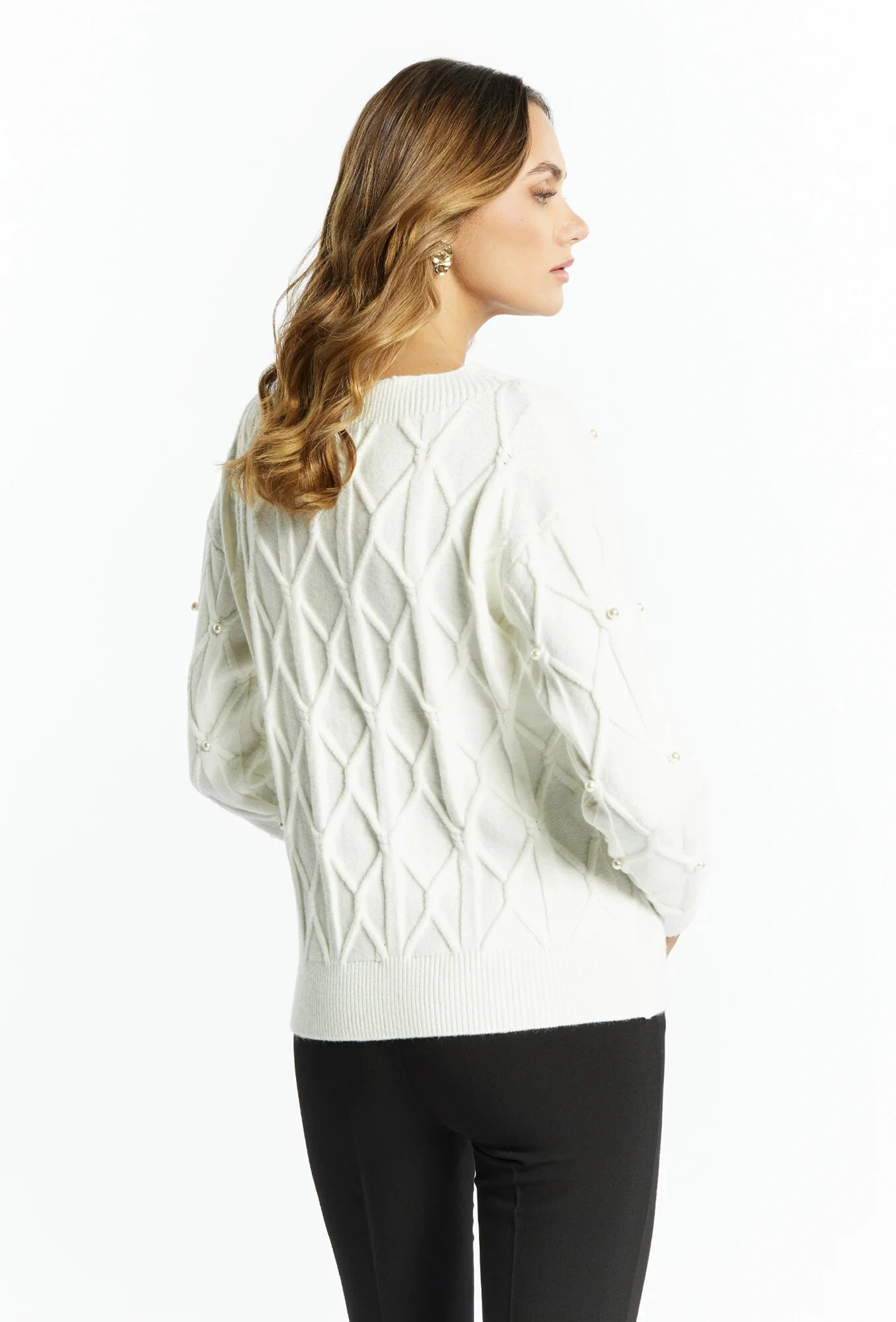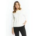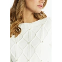 Dámský svetr s úpletem. Svetr s dlouhými rukávy a půlkruhovým výstřihem. Kromě toho je svetr zdoben malými korálky. Tento model bude jistě dobře fungovat v chladných dnech. Modelka na fotografii měří 177 cm a nosí velikost S.