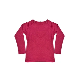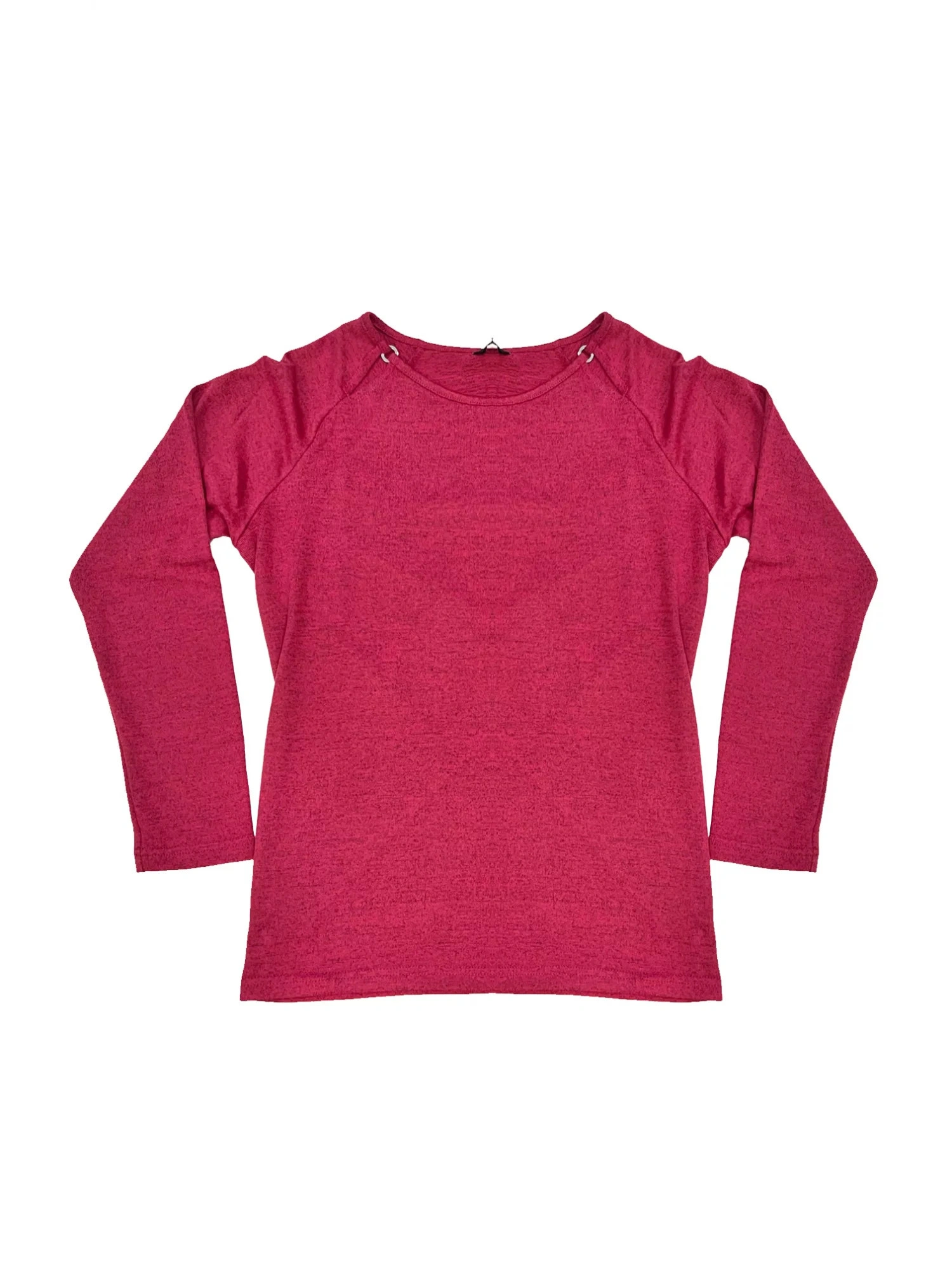 Dámský svetřík s dlouhým rukávem, u krku kulatý výstřih s rafinovanými průstřihy po obou stranách, které drží kovový kroužek.