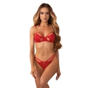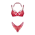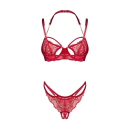 Sytě červená barva, elegantní krajka a detaily, které nikdo nepřehlédne. Podprsenka s kosticemi jemně zdůrazňuje poprsí, zatímco zlaté řetízky na ramínkách dodávají jedinečný nádech. Tanga s otevřeným rozkrokem, zdobená krajkou a třpytivým řetízkem přes zadní část, jsou čistou fantazií. Každý detail zde má svůj význam – dokonce i malý přívěsek vpředu, který koketně upoutá pozornost. Je to více než jen spodní prádlo. Je to příslib večera plného potěšení a vášně.