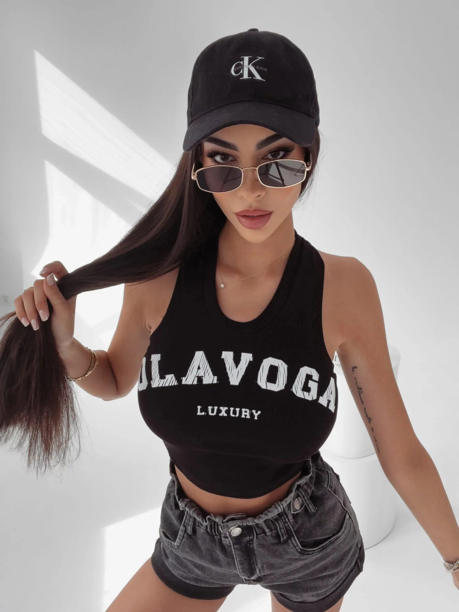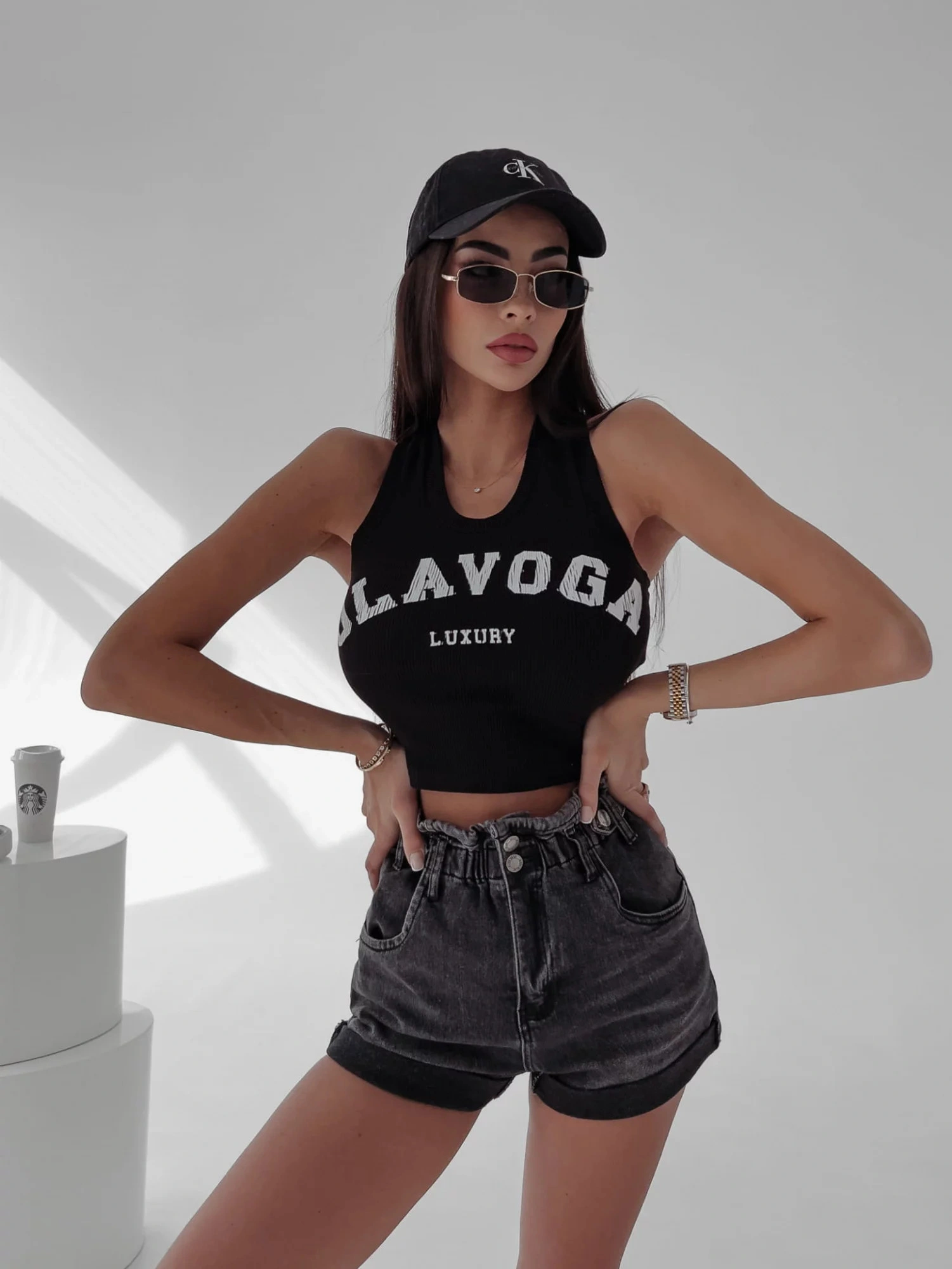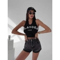 Krátký top od značky Ola Voga - široká ramínká  - potisk OLAVOGA LUXURY - žebrovaná textura - kulatýVíce