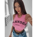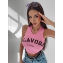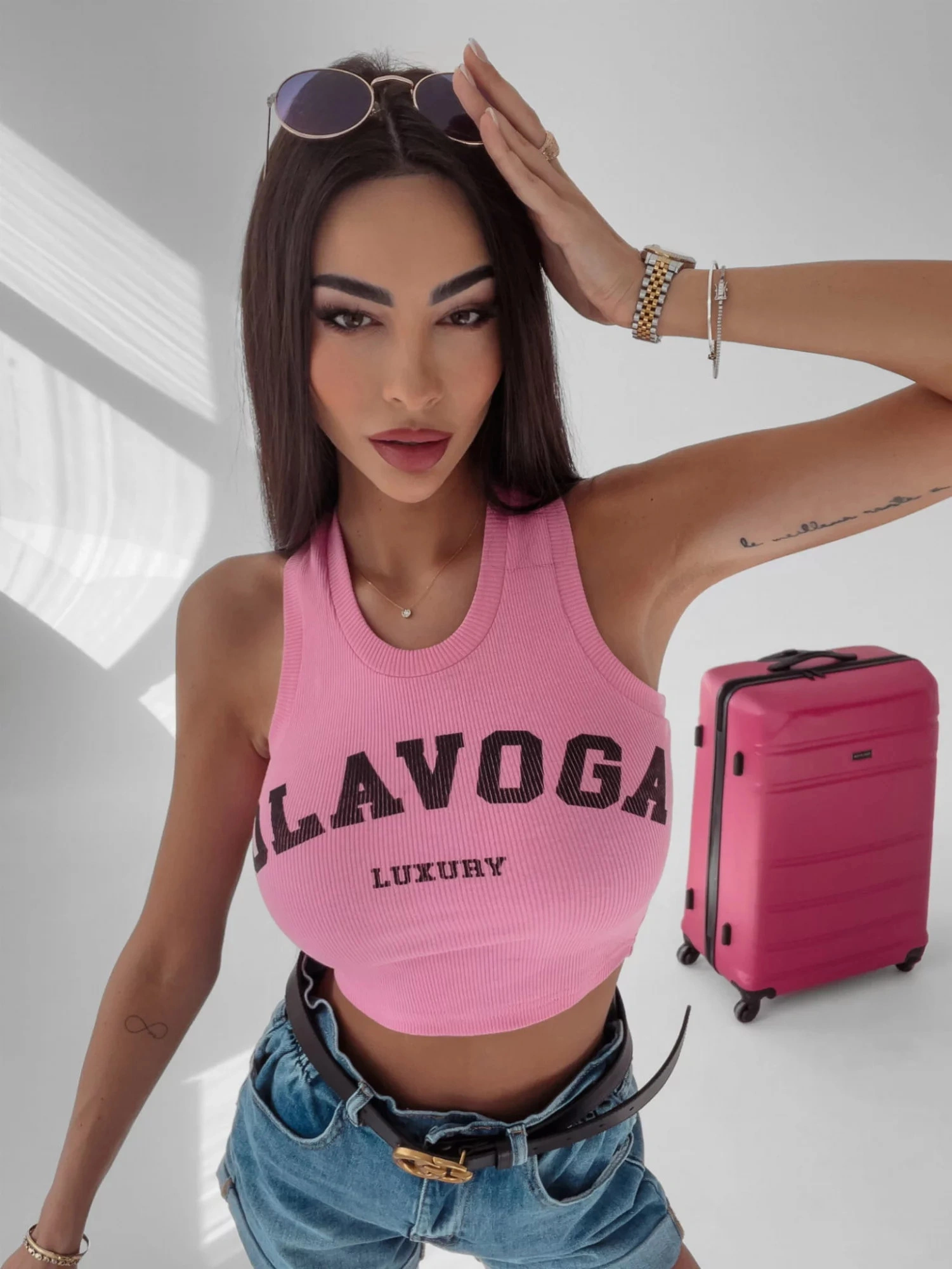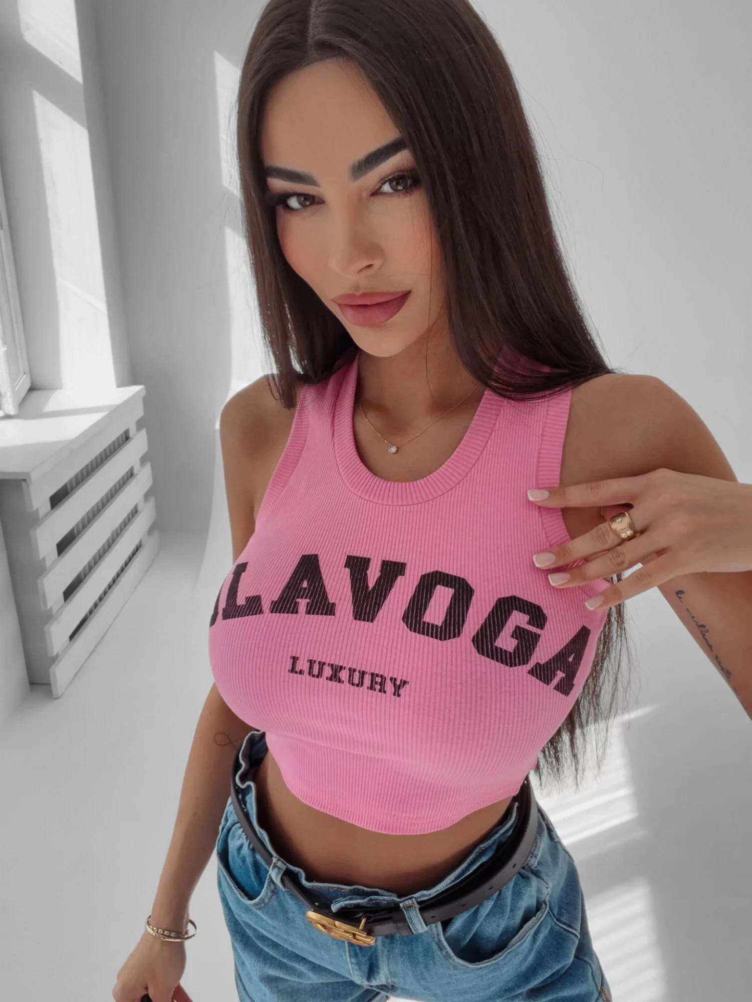 Krátký top od značky Ola Voga - široká ramínká  - potisk OLAVOGA LUXURY - žebrovaná textura - kulatýVíce