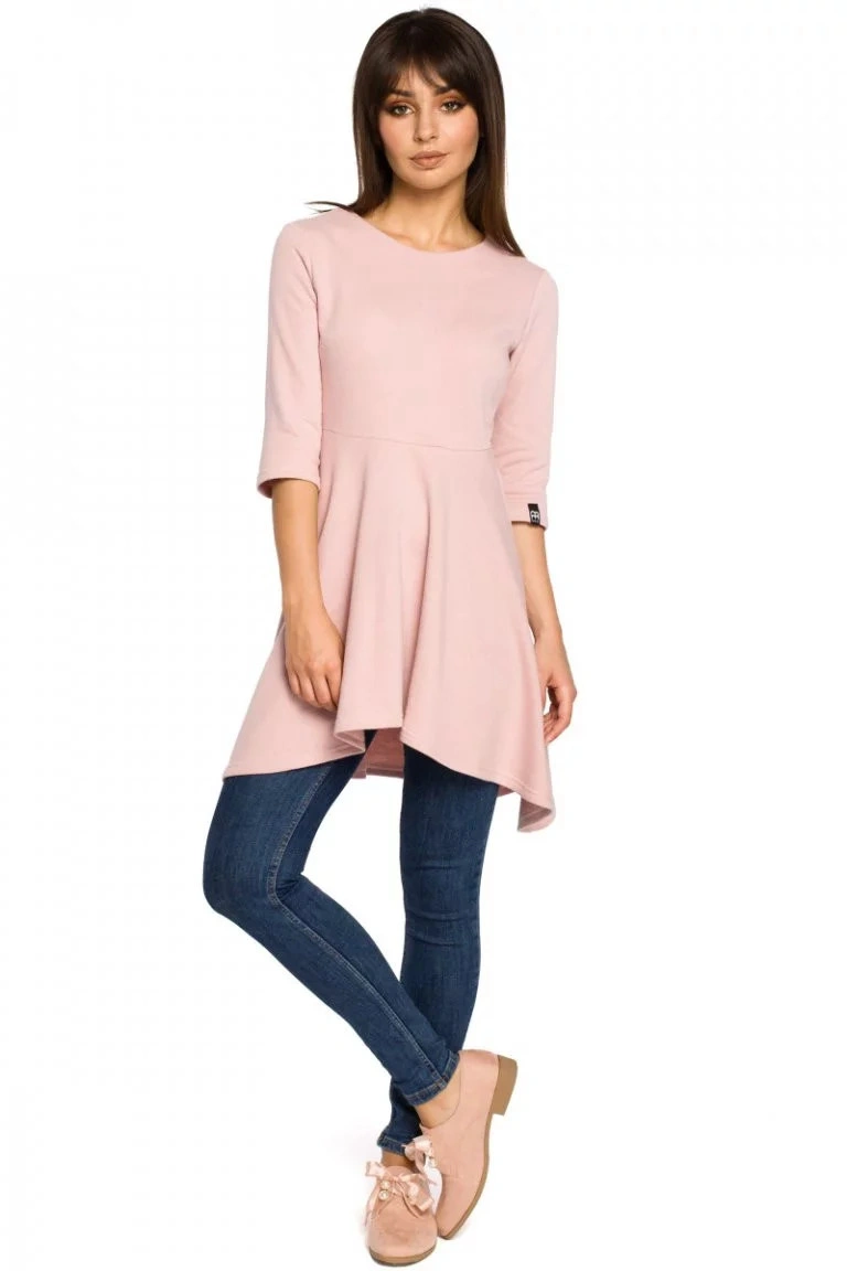 Šaty z pletené mikiny, v pase přestřižené. Výstřih a rukávy zakončené lemováním v kontrastní barvě.