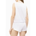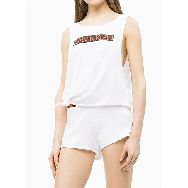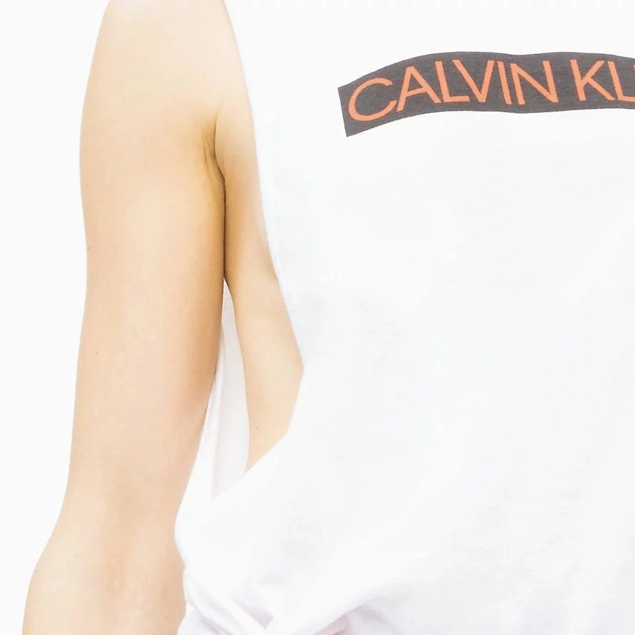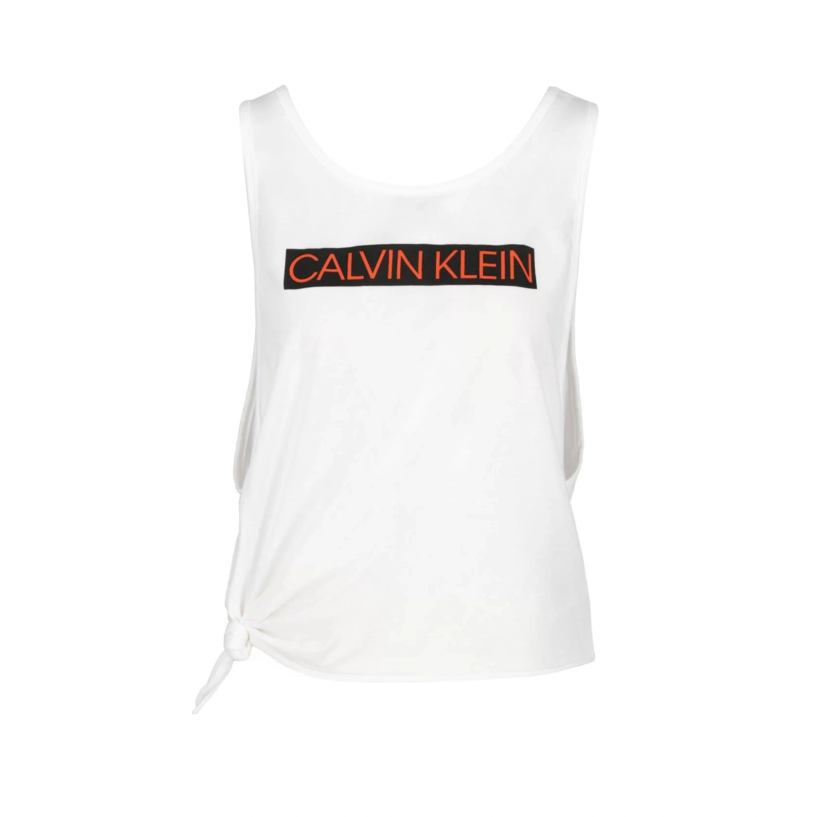 Toto dámské tílko od značky Calvin Klein je elegantní a stylové. Má kulatý výstřih a je mírně rozšířené s uzlíčkem na pravém boku, což dodává oblečení zajímavý detail. Logo značky je umístěno na hrudi tílka, což zaručuje autentičnost produktu.