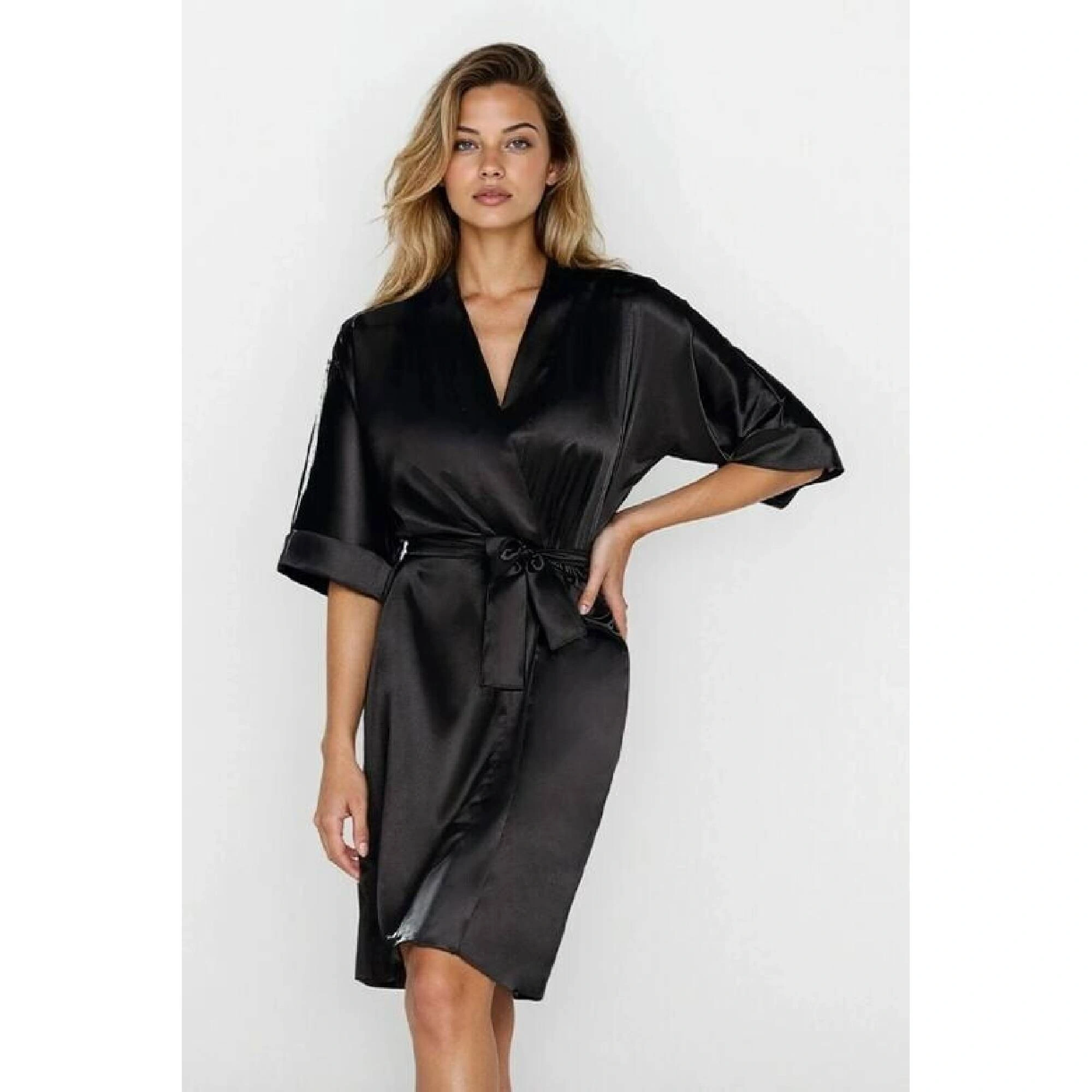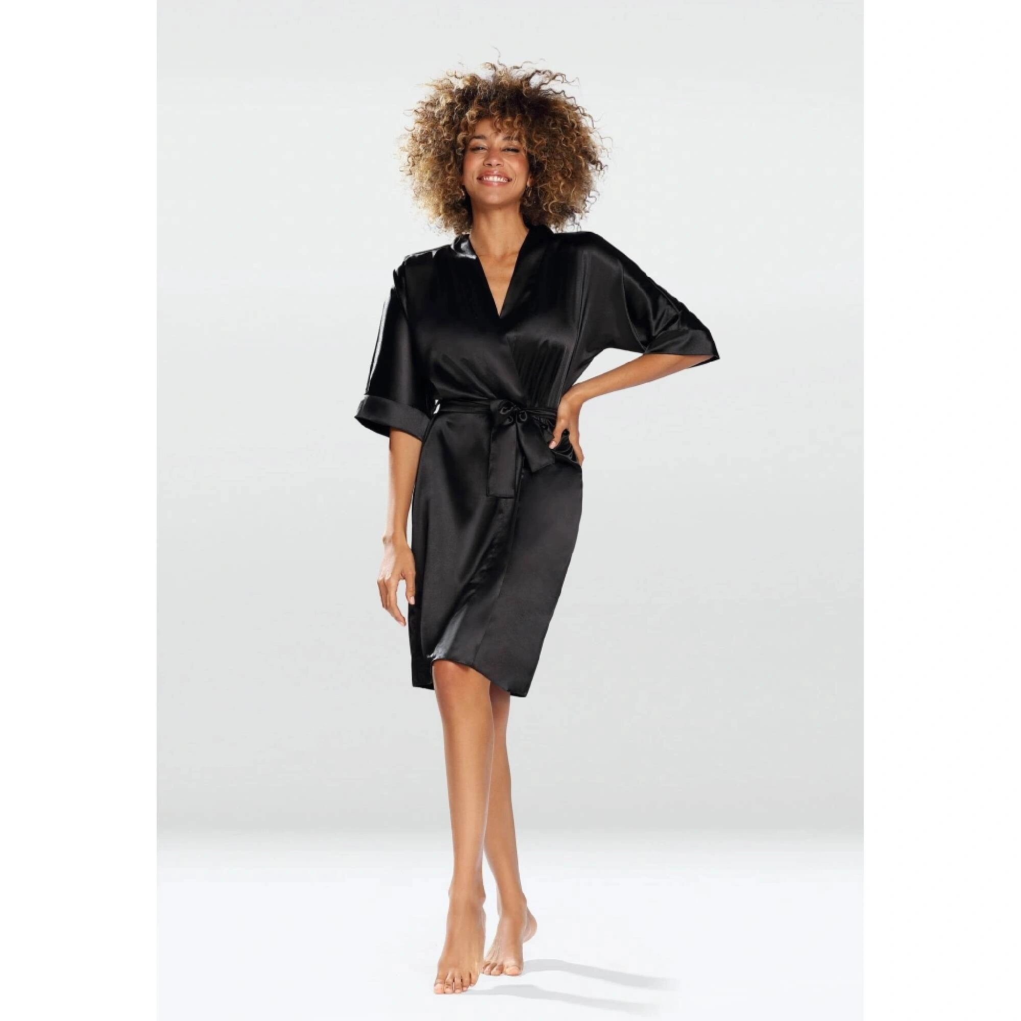 Dámský župan 100 Černá - DKaren Hladká tkanina Volný, pohodlný střih Baleno v krabici Polský výrobe