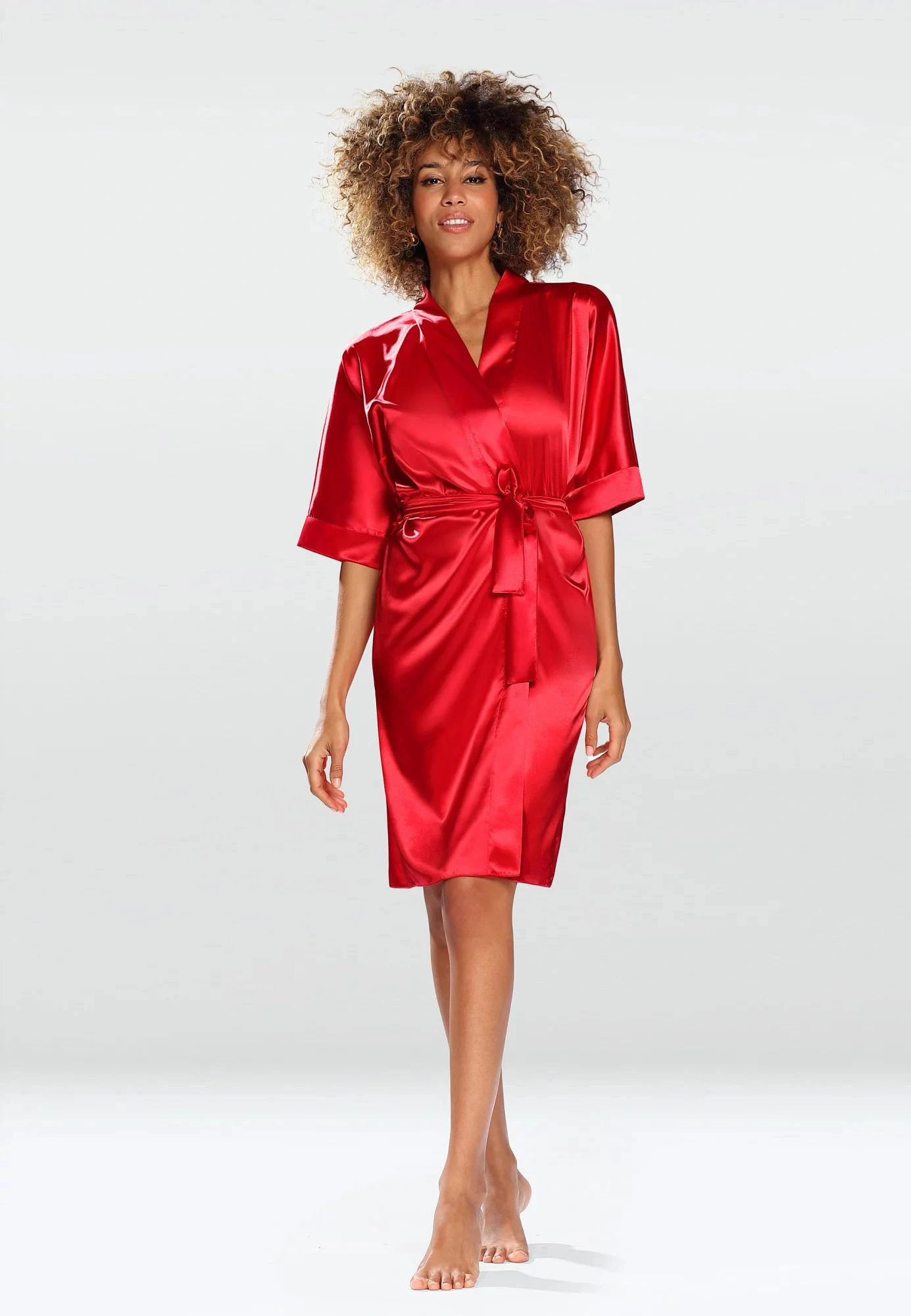 Pohodlný dámský saténový župan DKaren 90 elegantního střihu.