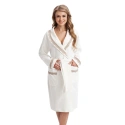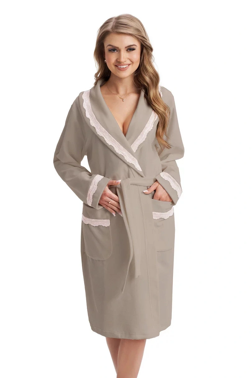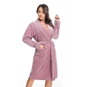 Elegantní dámský velurový župan. Límec i kapsy jsou obšité krajkou. V pase na zavázání.
