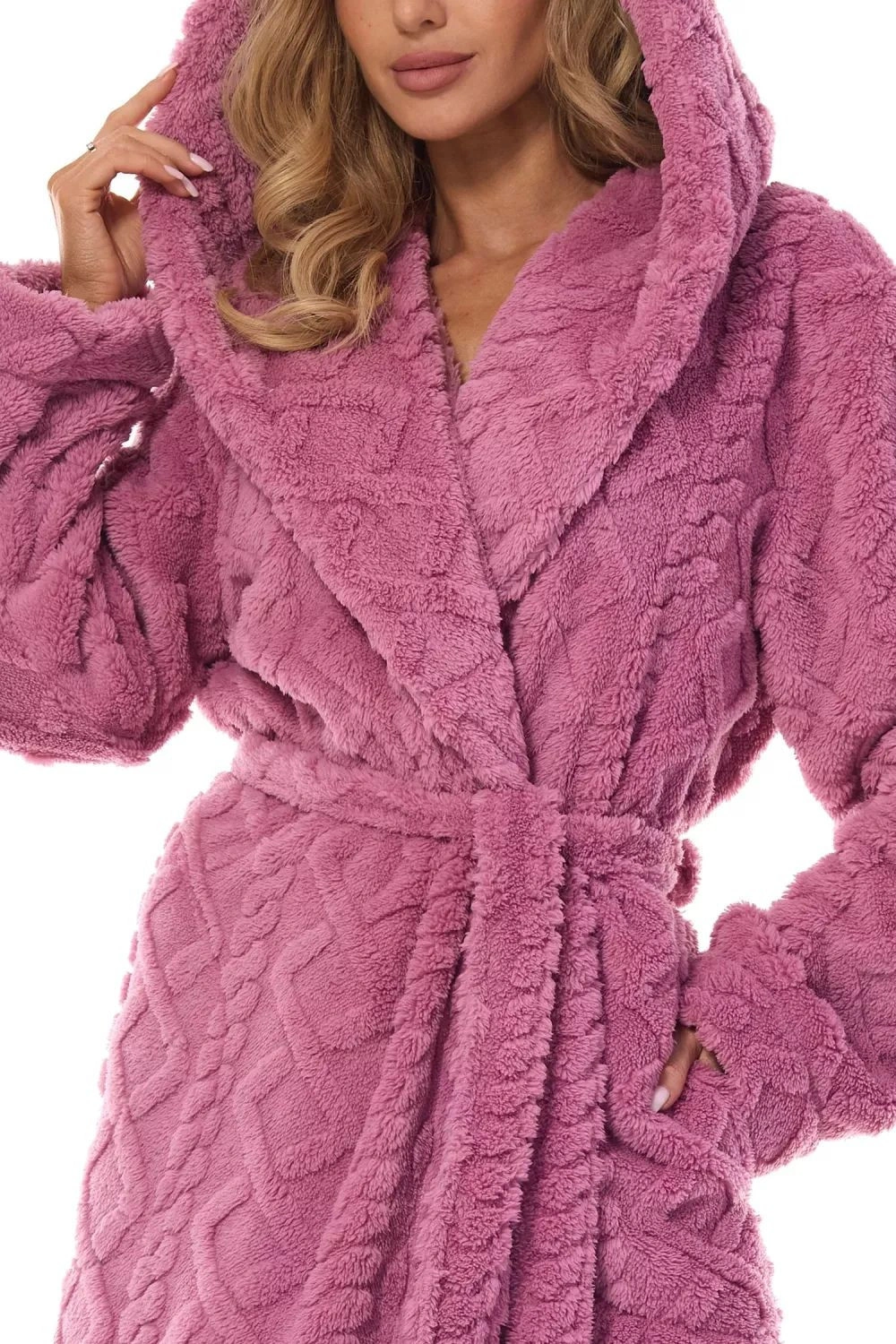 Dámský župan 2402 Geo L&L - z měkkého materiálu typu soft - protlačený vzor - na bocích kapsy - zavazování v pase na pásek - s kapucí - dlouhý