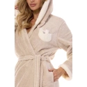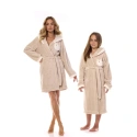 Dámský krátký župan s kapucí ze super měkkého úpletu, na úrovni hrudníku našitá nadýchaná aplikace. Zavazování v pase, na úrovni boků kapsy.