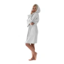 Dámský župan je klasického střihu s kapucí, zavazováním na pásek.