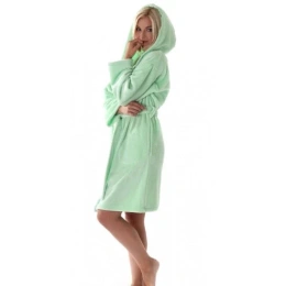 Dámský župan je klasického střihu s kapucí, zavazováním na pásek.