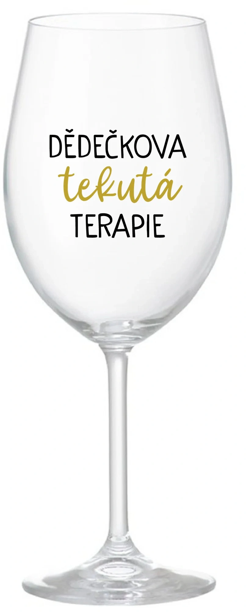 Vinná čirá sklenice s originálním motivem DĚDEČKOVA TEKUTÁ TERAPIE je krásným a osobitým dárkem, které ale využijete i Vy sami třeba ve chvílích, kdy si budete chtít zpříjemnit náročný den. Tyto originální vinné sklenice jsou totiž nejen pro výjimečné události, ale i pro běžné večery, které si chcete zpříjemnit sklenkou dobrého vína. Jistě proto potěší každého milovníka vína, i toho, kdo si umí svůj život vychutnat plnými doušky.