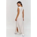 Elegantní maxi šaty vyrobené z lehké viskózové pleteniny jsou ideální volbou na jarní a letní dny. Vyznačují se volným střihem a pohodlným vázáním v pasu, které dodává ženskosti a umožňuje přizpůsobení šatů postavě, zajišťující přitom pohodlí po celý den. Kulatý výstřih zajišťuje univerzálnost a absence rukávů z ní dělá skvělou volbu na teplejší dny. Maxi délka jí dodává eleganci a boční rozparky koketnosti a lehkosti, zároveň do stylizace přináší dynamický a moderní akcent. Šaty mají klasický a minimalistický střih, který se skvěle hodí jak do každodenních, tak do formálních kombinací. Je to univerzální volba, která se hodí na různé příležitosti. Kombinujte je se sportovními botami na běžné nošení nebo elegantními sandály, což z ní udělá ideální volbu na výlety do města, procházky nebo víkendový relax.