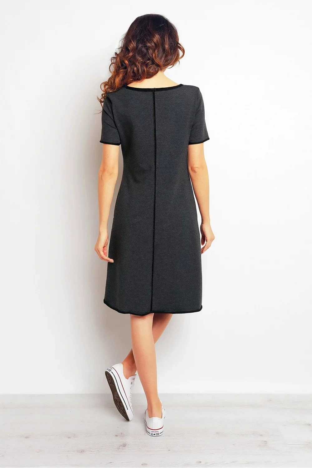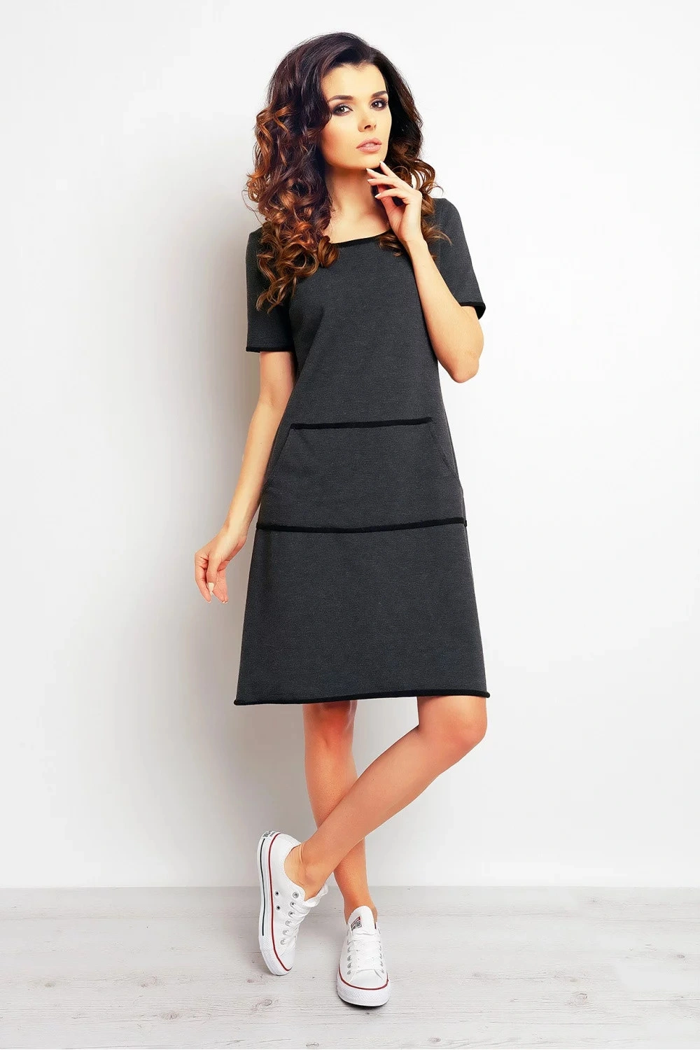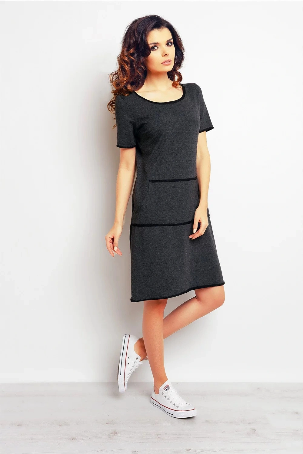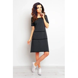 Dámské denní šaty dlouhé nad kolena, kulatý výstřiih, krátký rukáv. Vepředu kapsa.