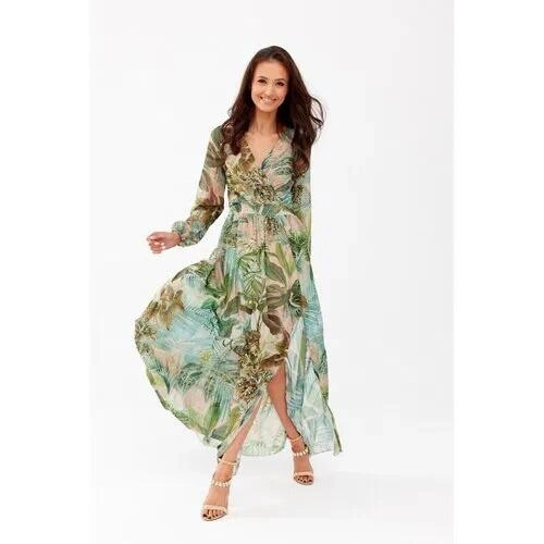 Módní šaty se skvělým střihem a maxi délkou. Šaty, které můžete bez obav nosit po celý rok. Velmi příjemná, vzdušná a na dotek jemná tkanina, skvělá pro všechny typy postavy. Šaty mají bezpečnou maxi délku a krásný splývavý střih, na který jsme umístili vzorovaný motiv. Díky jemně zúženému pasu, propletenému výstřihu a rozparku, který zeštíhluje nohy, celek tajemně zvýrazní vaše půvaby. Šaty s dlouhými, bufetovými rukávy mají na zádech průstřih se zavazováním a zapínáním na zip. Tento model je podšitý spodničkou. Šaty se vyznačují bohatou dostupností barevných variací. Díky ní nepochybně vyniknete z davu a budete se cítit velmi žensky. Jejich délka a šílená barevná kombinace z vás udělají hvězdu každého večera. Skvěle se hodí na formální vycházky, budou ideálními šaty na svatbu. Výrobek je vyroben a ušit v Polsku.