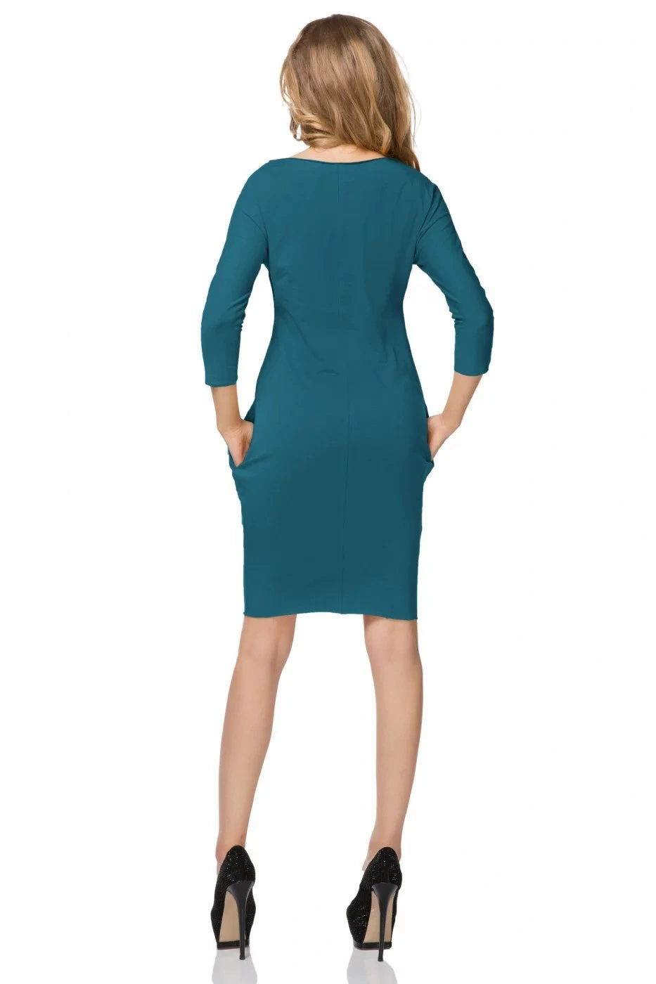 Sportovní šaty s lodičkovým výstřihem. Kapsa na bocích ve švu. Zadní řez. Spodní díl, rukávy a výstřih zůstaly nezpracované.