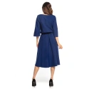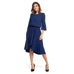 Elegantní asymetrické midi šaty s 3/4 rukávy. Zadní část šatů je delší, přední část je otevřená. Šaty jsou v pase nařasené gumičkou a navíc mají pásek v barvě šatů na zavázání.