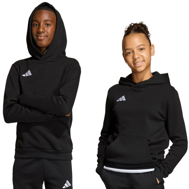 Mikina adidas Entrada 26 Hoody black JZ6569 je nezbytnou součástí výbavy každého mladého fotbalisty. Měkká konstrukce z prodyšné bavlny a odolného polyesteru, která nedráždí pokožku. Zateplený vnitřní střih. Klasický střih poskytuje plný rozsah pohybu. Přední kapsa. Integrovaná, nenastavitelná kapuce chrání hlavu před nepřízní počasí. Žebrované manžety a spodní lem. Vyšívané logo výrobce. Materiál: 70 % bavlna, 30 % recyklovaný polyester.
