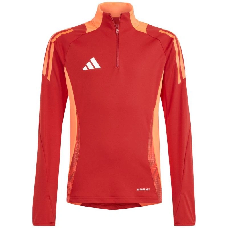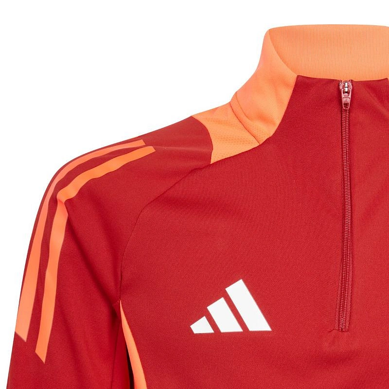 Dětská tréninková mikina adidas Tiro 24 Competition Training Top červeno-oranžová IS1652 Tato dětská fotbalová mikina adidas je ideální na trénink. Stojáček s žebrovaným lemem. Krátký zip. Přizpůsobený střih. Technologie Aeroready pomáhá vysušovat pokožku a zvyšuje pohodlí. Síťované panely na ramenou a bocích. Pruhy na horní části rukávů. Materiál: přiléhavý úplet, 100% recyklovaný polyester.