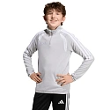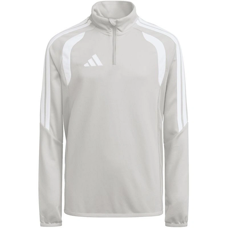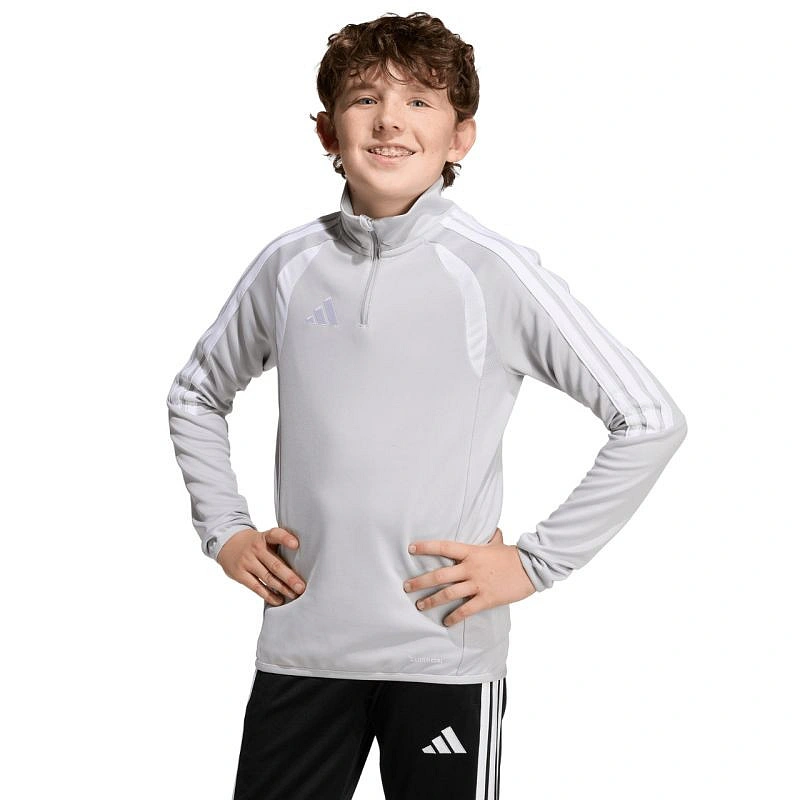 Dětská fotbalová mikina adidas Tiro 26 League Training Top šedá KC3695 Tato dětská fotbalová mikina adidas je ideální na trénink. Zakončená nášivkou na ochranu brady, zapínání na krátký zip. Přizpůsobený střih. Technologie Climacool je funkční řešení, které vás udrží v chladu a suchu a umožní vám soustředit se na hru. Spodní část a manžety zakončené elastickým lemováním. Kontrastní síťované vsadky. Pruhy na rukávech. Jemné logo na hrudi. Materiál: 100% recyklovaný polyester.