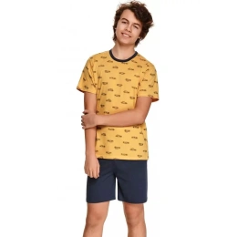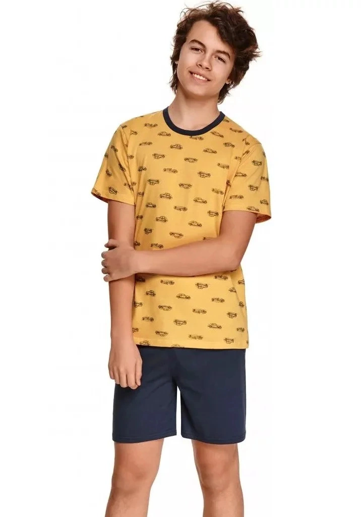 Chlapecké pyžamo Taro s krátkým rukávem a šortkami. Pyžamo má krátký rukáv, kulatý výstřih a potisk autíček. Šortky jsou jednobarevné, dokonale ladí k hornímu dílu.