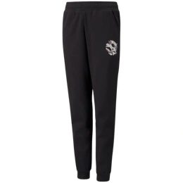Dětské kalhoty Puma jsou definicí pohodlí. Model v minimalistickém stylu má měkkou konstrukci s vysokým obsahem bavlny, která nedráždí a stará se o přirozenou ventilaci těla. Přídavek polyesterových vláken zvyšuje odolnost. Elastický pas nastavitelný pomocí stahovací šňůrky. Boční kapsy na drobnosti. Žebrování ve spodní části nohavic. Model v černé barvě se zajímavou grafikou na nohavici.