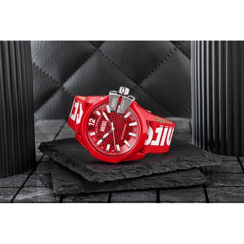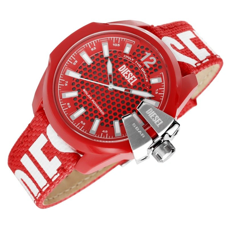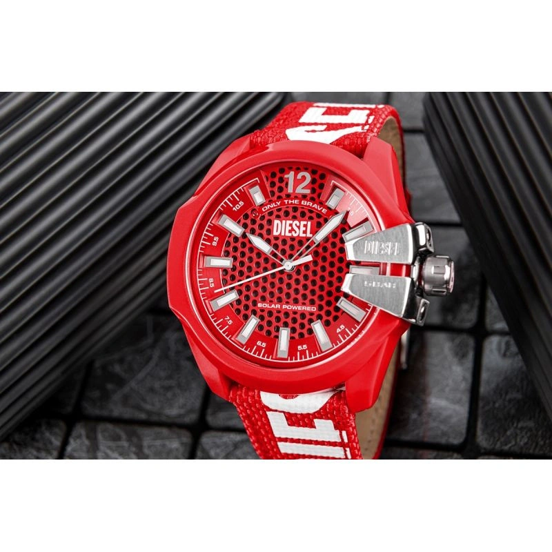 Výrazné a moderní hodinky vybavené solárním mechanismem, který čerpá energii ze světla, čímž odpadá nutnost výměny baterií. Intenzivní červená barva obalu a řemínku doplněná bílými detaily jim dodává sportovní a dynamický vzhled. O čitelnost se stará jedinečný perforovaný ciferník s černo-červeným motivem s přehlednými indexy a číslicí 12. Řemínek je vyroben z odolného textilního materiálu s velkým kontrastním logem DIESEL, které podtrhuje streetwearový styl hodinek.