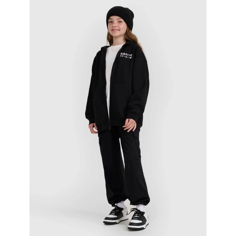 tato dívčí mikina je ideální volbou pro chladnější dny - měkký úplet s vysokým obsahem bavlny vám zajistí pohodlí, zatímco počesaný vnitřek pomáhá udržet teplo po celý den. Volný oversize střih zaručuje plnou volnost pohybu, zatímco praktické rozepínání na zip činí mikinu ideální pro proměnlivé počasí. Kapuce v kombinaci s výstřihem poskytuje dodatečnou ochranu před větrem, zatímco dvě kapsy v přední části usnadňují uložení drobných předmětů.