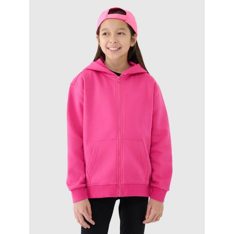 bluza dresowa dziewczęca 4F rozpinana z kapturem to wygodna i uniwersalna propozycja, która doskonale sprawdzi się zarówno w codziennych stylizacjach casualowych, jak i podczas aktywności sportowych. Oversizowy krój luźno układa się na sylwetce, zapewniając swobodę ruchów i komfort noszenia, a standardowa długość do bioder sprawia, że bluza jest praktyczna i łatwa do zestawienia z innymi elementami garderoby. Wykonana z miękkiej dzianiny single jersey o gładkiej powierzchni, jest elastyczna i przyjemna w dotyku. Średnia gramatura 280 gsm zapewnia dobrą równowagę między lekkością a komfortem cieplnym. Jednostronnie czesane wnętrze dodatkowo ociepla, dzięki czemu bluza świetnie sprawdzi się w chłodniejsze dni. Wysoka zawartość bawełny (80%) gwarantuje naturalny komfort, a dodatek poliestru (20%) zwiększa trwałość i pomaga zachować fason nawet przy intensywnym użytkowaniu. Funkcjonalne detale, takie jak zintegrowany kaptur, jednokierunkowy zam