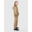 bluza dresowa dziewczęca 4F rozpinana z kapturem to wygodna i uniwersalna propozycja, która doskonale sprawdzi się zarówno w codziennych stylizacjach casualowych, jak i podczas aktywności sportowych. Oversizowy krój luźno układa się na sylwetce, zapewniając swobodę ruchów i komfort noszenia, a standardowa długość do bioder sprawia, że bluza jest praktyczna i łatwa do zestawienia z innymi elementami garderoby. Wykonana z miękkiej dzianiny single jersey o gładkiej powierzchni, jest elastyczna i przyjemna w dotyku. Średnia gramatura 280 gsm zapewnia dobrą równowagę między lekkością a komfortem cieplnym. Jednostronnie czesane wnętrze dodatkowo ociepla, dzięki czemu bluza świetnie sprawdzi się w chłodniejsze dni. Wysoka zawartość bawełny (80%) gwarantuje naturalny komfort, a dodatek poliestru (20%) zwiększa trwałość i pomaga zachować fason nawet przy intensywnym użytkowaniu. Funkcjonalne detale, takie jak zintegrowany kaptur, jednokierunkowy zam