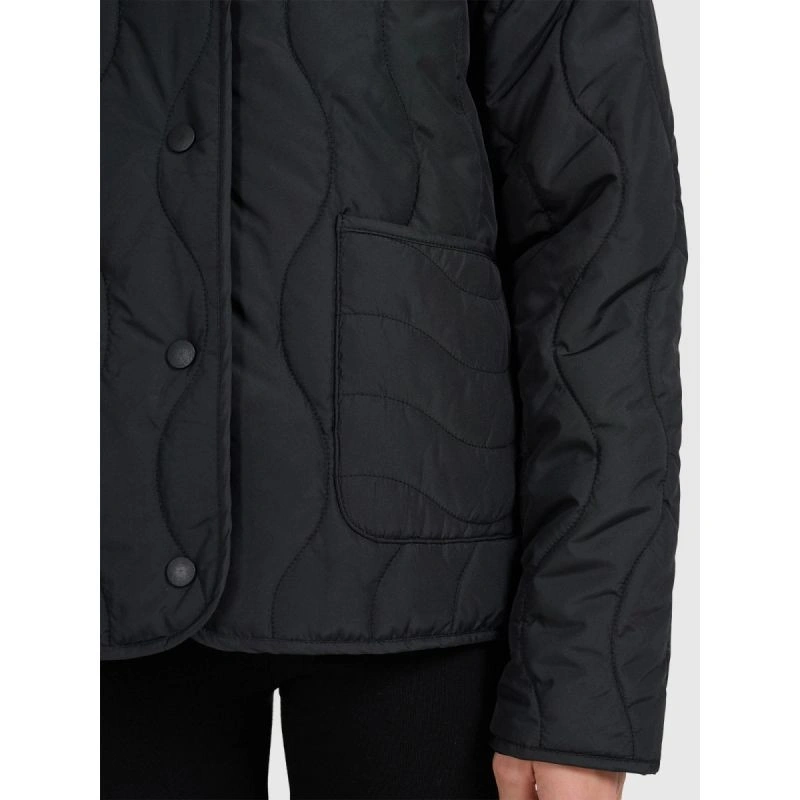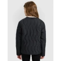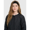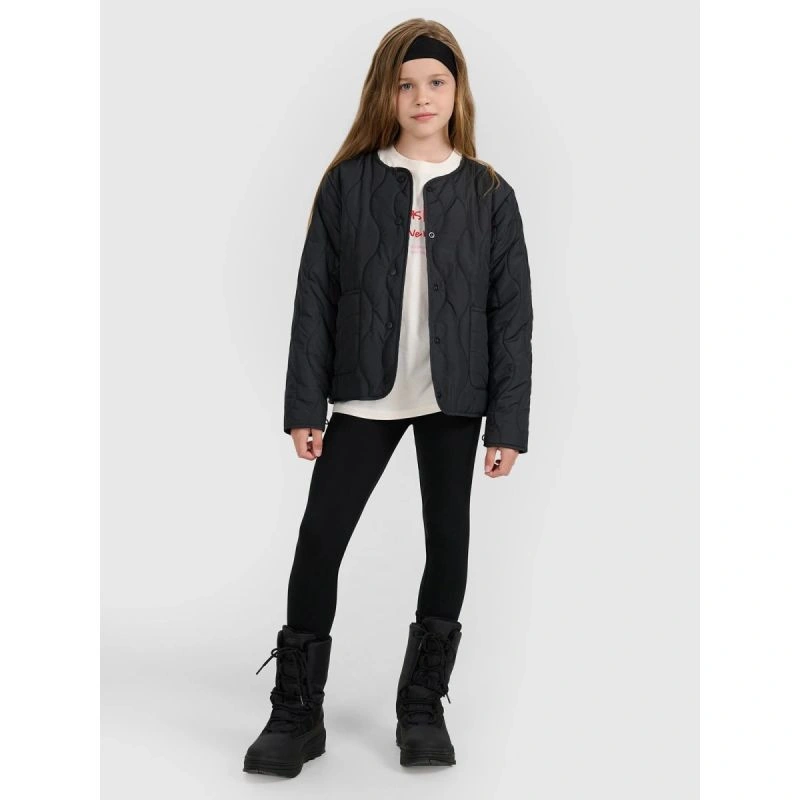 tato dívčí péřová bunda 4F byla vytvořena jako praktická a pohodlná vrstva pro teplejší nebo zamračené dny přechodného období. Střih oversize volně sedí na těle pro volnost pohybu, zatímco prošívání ve zvlněných liniích dodává moderní a jedinečný nádech. Lehká polyesterová izolace zajišťuje tepelný komfort, zatímco hladká polyesterová podšívka usnadňuje oblékání a zpříjemňuje nošení. Elastická poutka s gumičkami umožňují bundu sepnout společně s kompatibilním modelem a vytvořit tak funkční komplet chránící před poryvy. Kovové zapínání na patentky a dvě otevřené boční kapsy zajišťují snadné používání a praktičnost. Jedná se o stylovou, lehkou a pohodlnou volbu pro každodenní nošení.