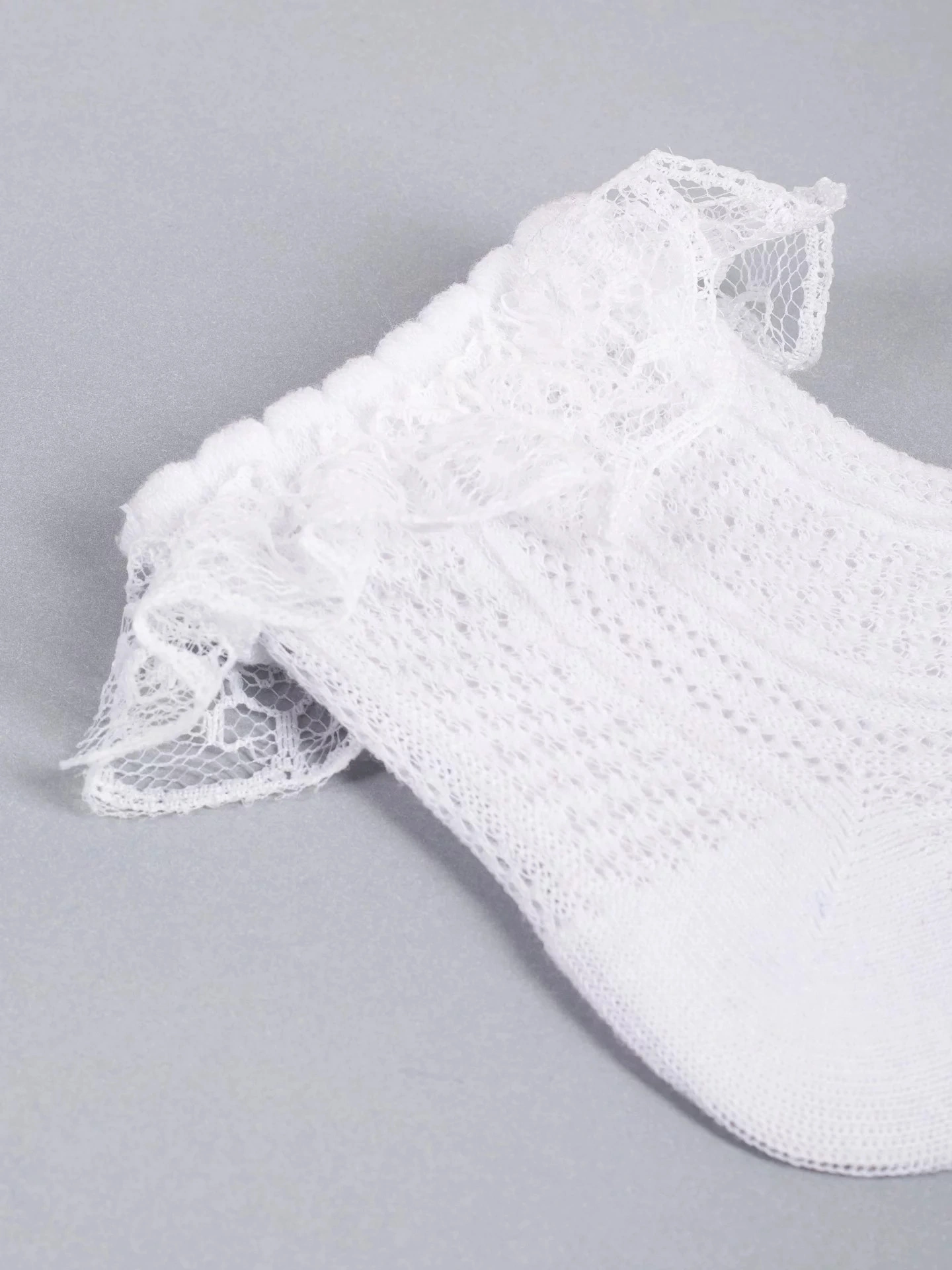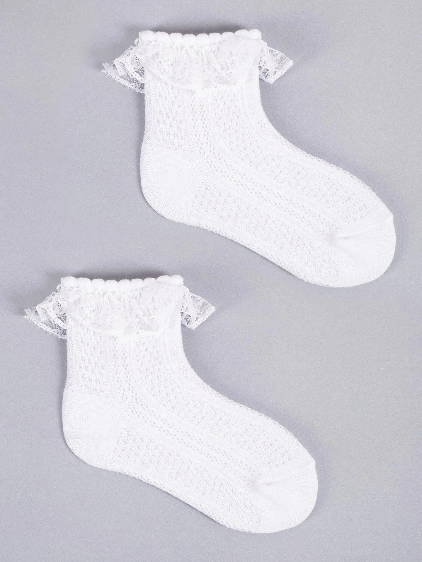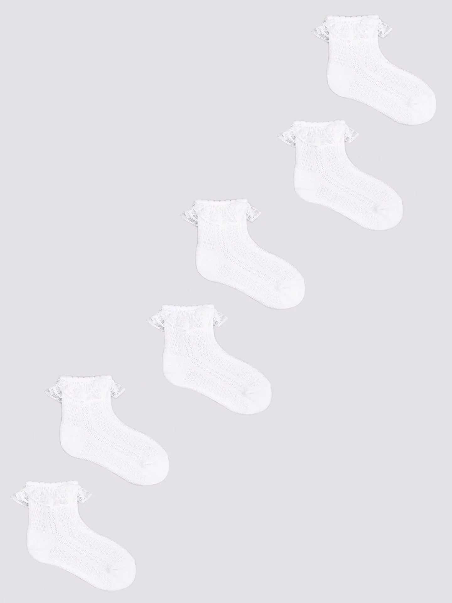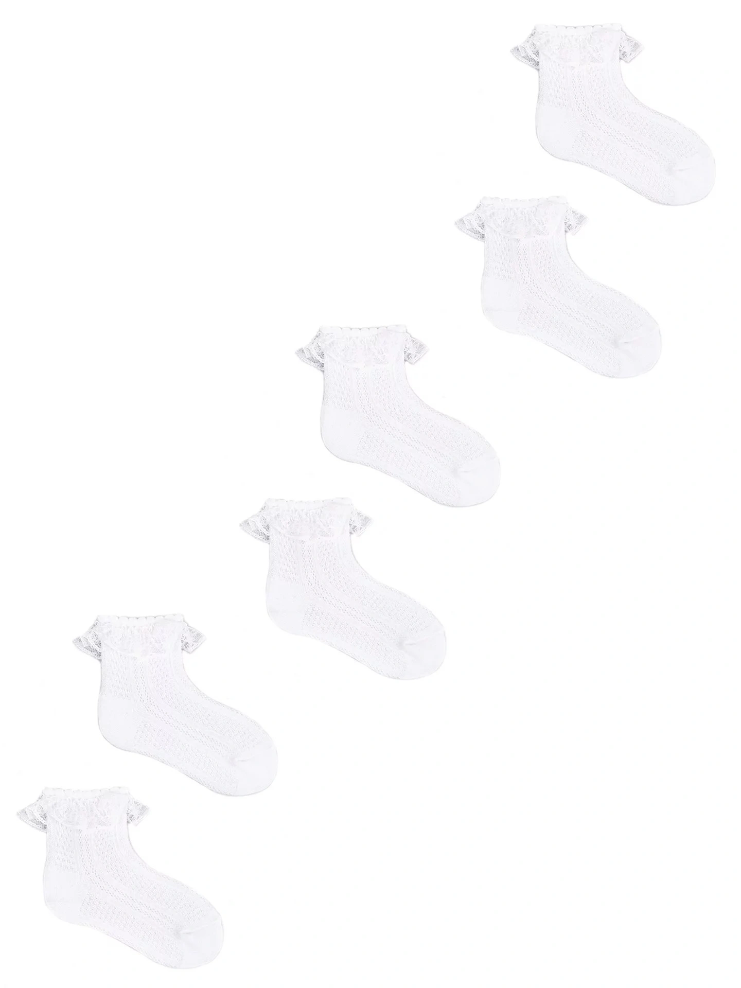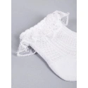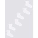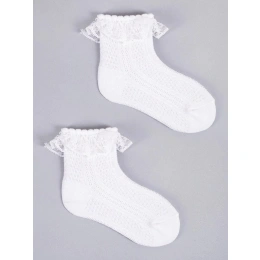 Dívčí ponožky se prodávají v praktickém trojbalení v bílé barvě. Ponožky jsou příjemné na dotek a mají nepřilnavý lem. Originální ozdobou je ohrnutí s jemným volánkem. Díky bavlněné ažurové struktuře jsou vzdušné a příjemné na dotek. Ideální pro teplejší dny.