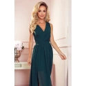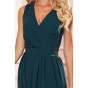 Šaty jsou ušité ze vzdušného materiálu v lahvově zelené barvě. Model se zapíná vzadu skrytým zipem. Tyto šaty značky Numoco jsou polským výrobkem.