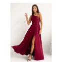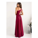 Dlouhé rovné šaty s asymetrickými ramínky, jedno tenké, druhé tlustší. Šaty se odřezávají v pasu, spodek je rozkročený. Šaty se zapínají na skrytý zip po straně. Na zádech ozdobné rozříznutí s pleteným uvazováním.
