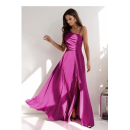 Dlouhé rovné šaty s asymetrickými ramínky, jedno tenké, druhé silnější. Šaty seříznuté v pasu, spodek rozšířený. Šaty se zapínají na skrytý zip po straně. Na zádech ozdobné prořezání s pleteným šněrováním.