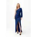 Tyto asymetrické šaty na jedno rameno s rukávy jsou vyrobeny z třpytivé, lesklé látky, která se na slunci krásně leskne. Maxi šaty mají vypasovaný střih, který skvěle přiléhá k tělu, a volánek, který zakryje případné nedokonalosti. Asymetrické šaty mají rozparek odhalující nohy a jeden dlouhý rukáv. Zapínají se na krytý zip umístěný v zadní části šatů. Dlouhé šaty působí velmi elegantně, takže se budou skvěle hodit na velké události, jako jsou svatby, Silvestr nebo plesy. Výrobek je vyroben a ušit v Polsku.
