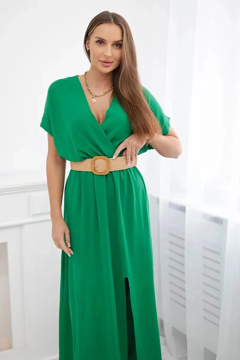 Představujeme vám pohodlné šaty s ozdobným páskem. Šaty mají dole rozparky.