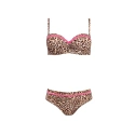 Vyztužená podprsenka typu "bardotka" má kostice. Košíčky jsou ve středu modelu nařasené a jsou ozdobené lemovkou v kontrastní barvě. Podprsenka se na zádech zapíná. Ramínka je možné nastavit i odepnout. Vzorované kalhotky barevně ladí s podprsenkou a v pase jsou ozdobené nařasením.