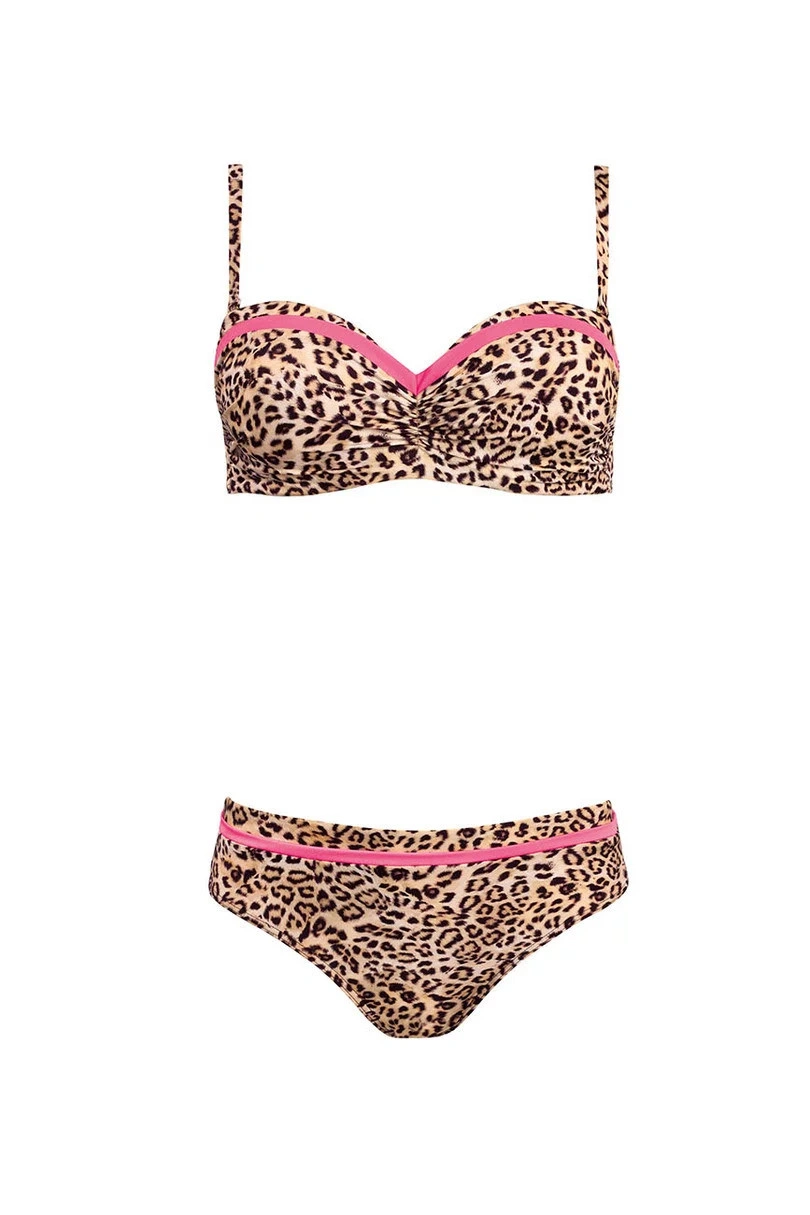 Vyztužená podprsenka typu "bardotka" má kostice. Košíčky jsou ve středu modelu nařasené a jsou ozdobené lemovkou v kontrastní barvě. Podprsenka se na zádech zapíná. Ramínka je možné nastavit i odepnout. Vzorované kalhotky barevně ladí s podprsenkou a v pase jsou ozdobené nařasením.
