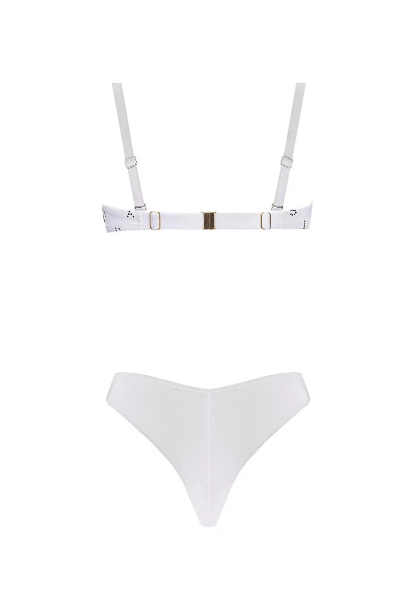 Podprsenka je typu push-up. Ramínka je možné nastavit i odepnout. Obvod podprsenky se zapíná kovovým klipsem. Komplet doplňují kalhotky s klasickým střihem.