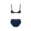 Dvoudílné dámské plavky s puntíky. Vrchní díl s kosticí, nevyztužený, s pevnými ramínky na posouvání. Kalhotky jsou vysoké, ve vrchní části přeložené a v případě potřeby je možné je zvednout až pod prsa. Vhodné i pro větší konfekční velikosti.
