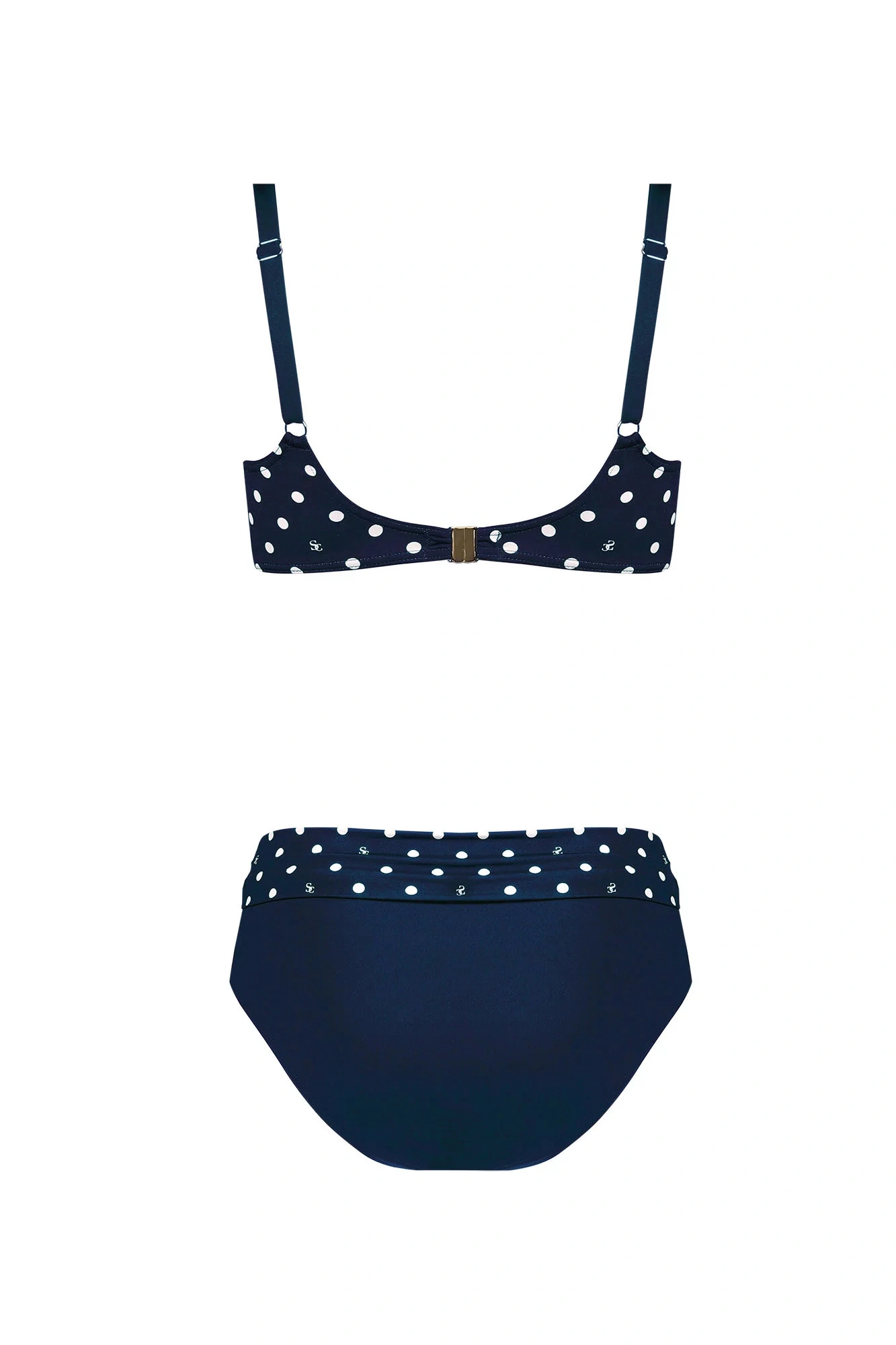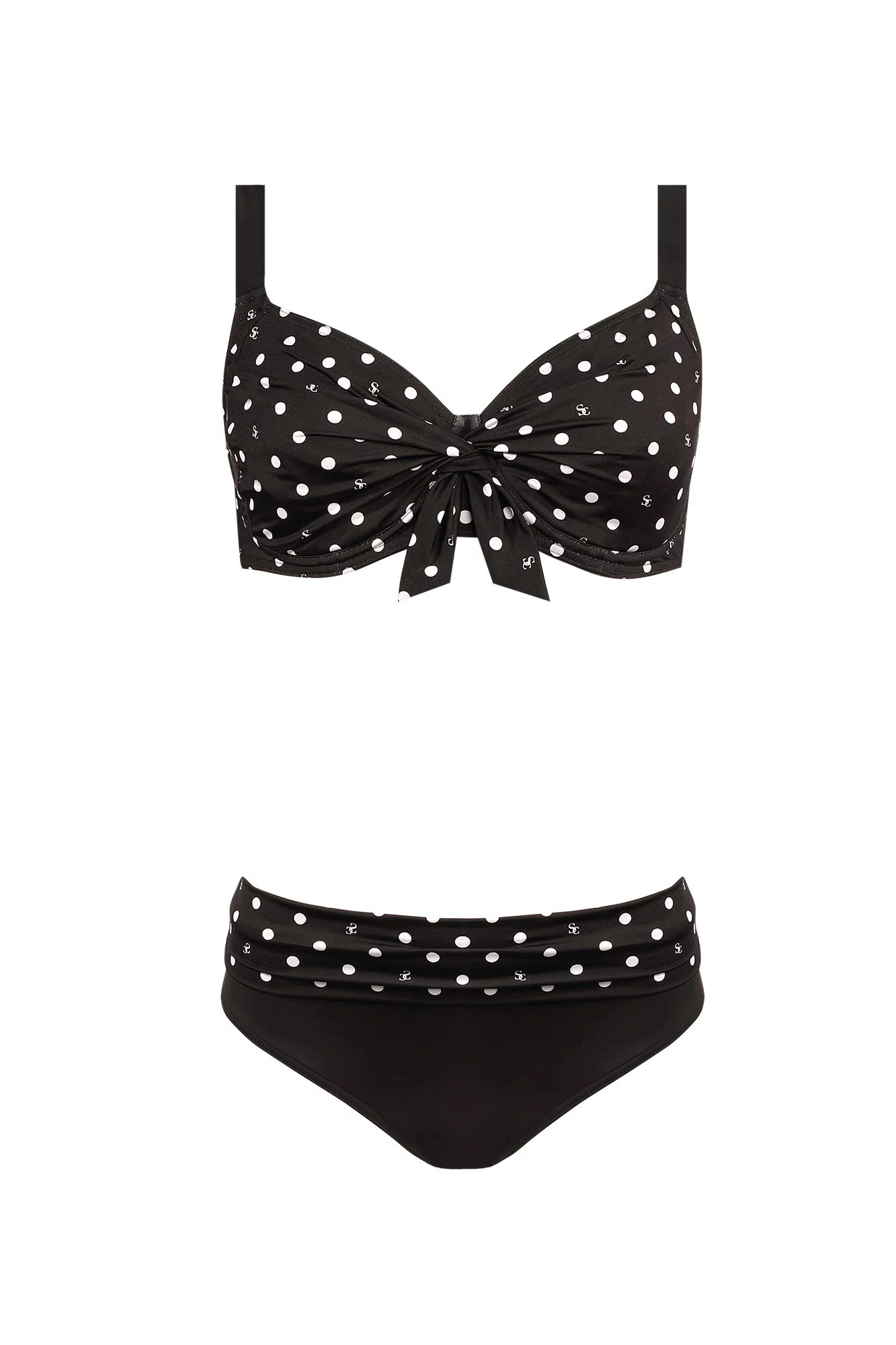 Dvoudílné dámské plavky s puntíky. Vrchní díl s kosticí, nevyztužený, s pevnými ramínky na posouvání. Kalhotky jsou vysoké, ve vrchní části přeložené a v případě potřeby je možné je zvednout až pod prsa. Vhodné i pro větší konfekční velikosti.