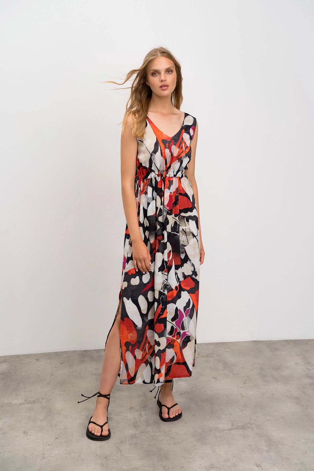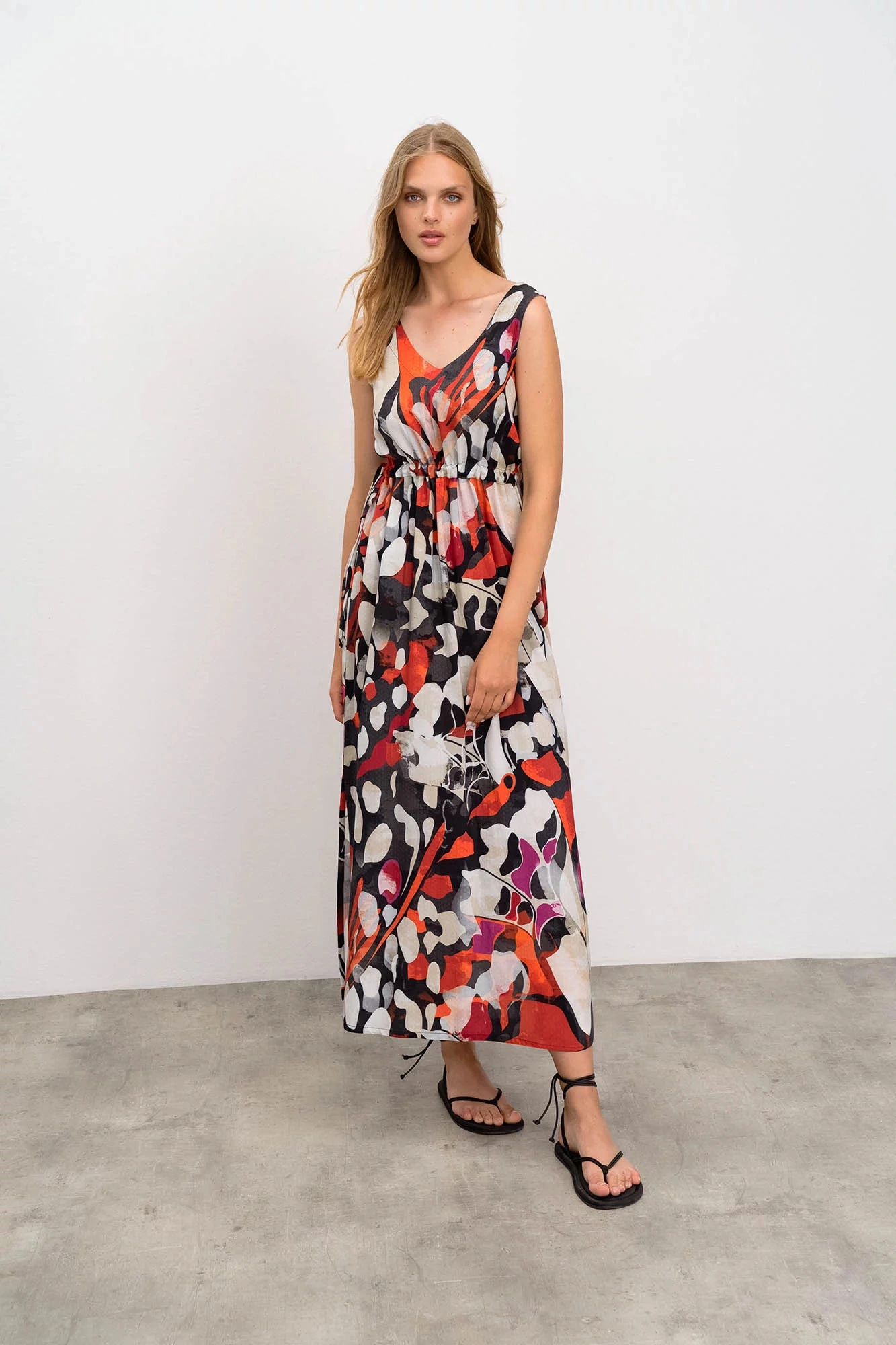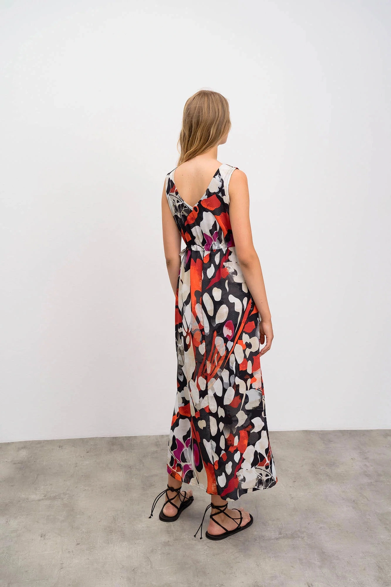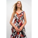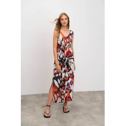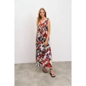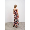 Elegantní vzorované dlouhé dámké šaty na ramínka s výsřihem do V. Šaty jsou vyrobené z kvalitního viskózového popelínu. Popelín je odolnou, pevnou, ale zároveň měkkou a na dotek příjemnou tkaninou, která je díky viskóze příjemně chladivá a ideální pro teplé letní období.