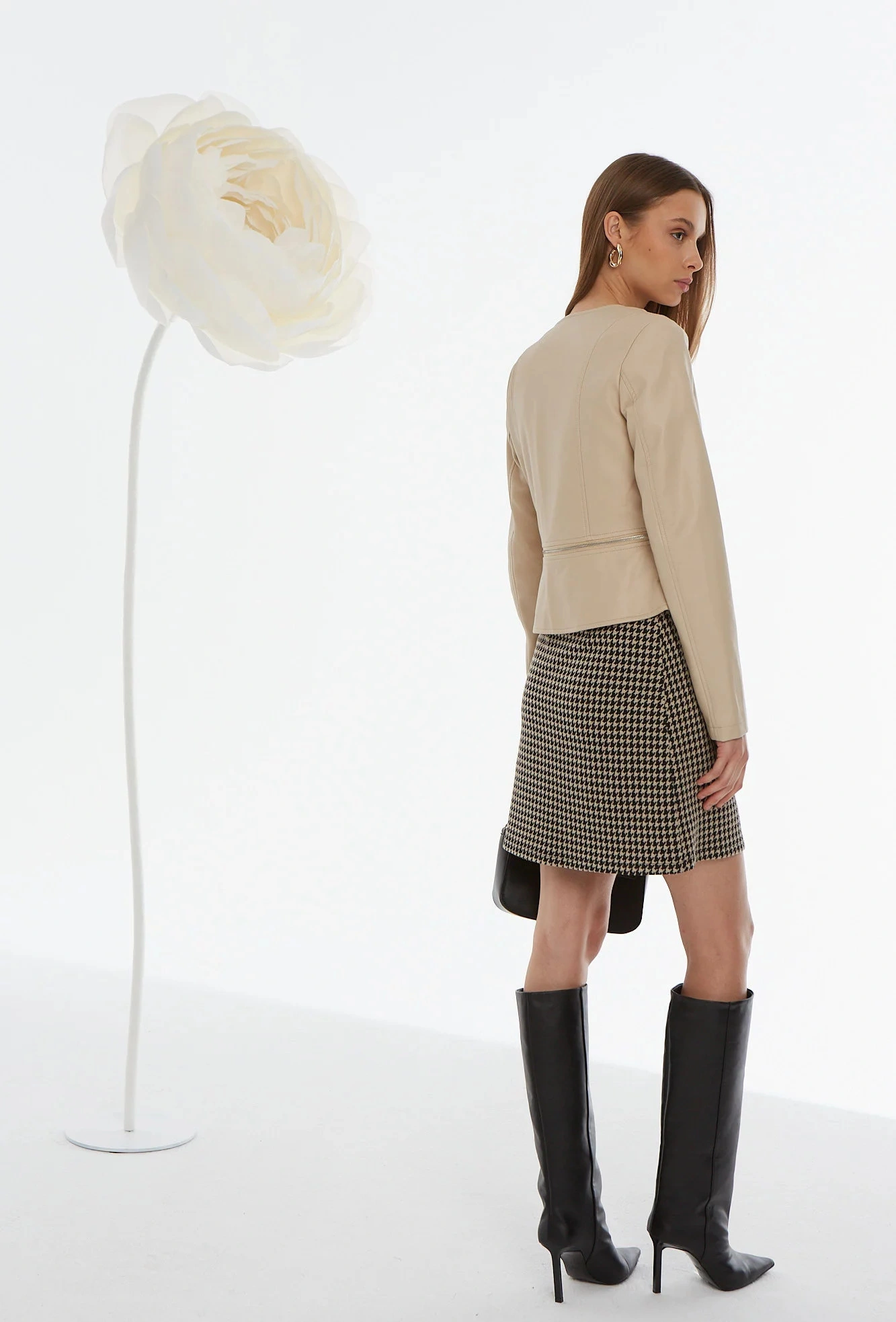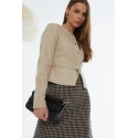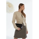 Béžová elegantní bunda z imitace kůže nesmí chybět v žádném dámském šatníku. Bunda rovného střihu, zapínání na stříbrné druky, kapsy na zip po stranách. V kruhu bundy je pásek na zip. Tento model doporučujeme kombinovat s bílými džínami. Bunda skvěle doplní každodenní i elegantní stylizaci. Modelka na fotografii měří 175 cm a nosí velikost 36.