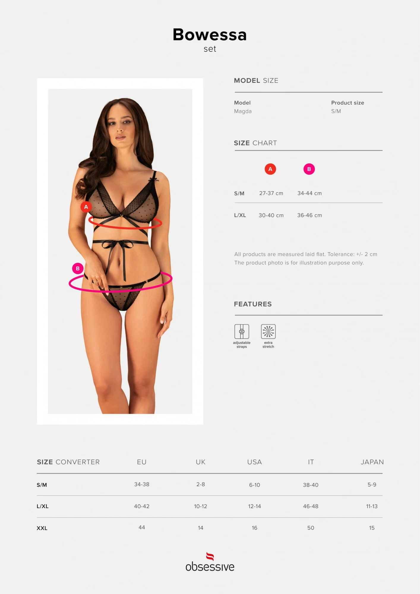 Sada vašich snů? Taková, ve které budete vypadat jako skutečná bohyně. Co takhle elegantní, lehce průsvitná černá látka zdobená roztomilými puntíky? Díky elegantním mašličkám budete chtít nosit soupravu Bowessa ještě dnes.