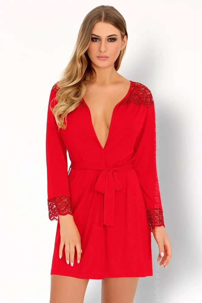 vyrobený z příjemné viskózy. Na rukávu i ramenou zdobený krajkou. Pásek kolem pasu pro snadné svázaní.