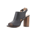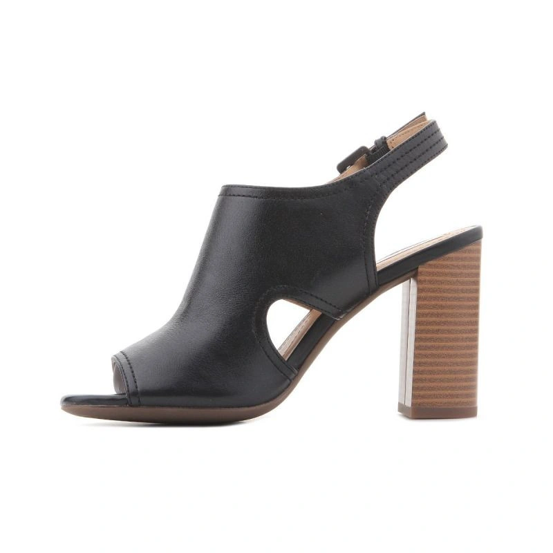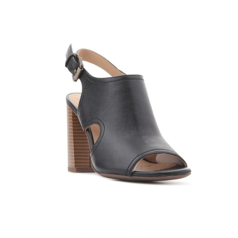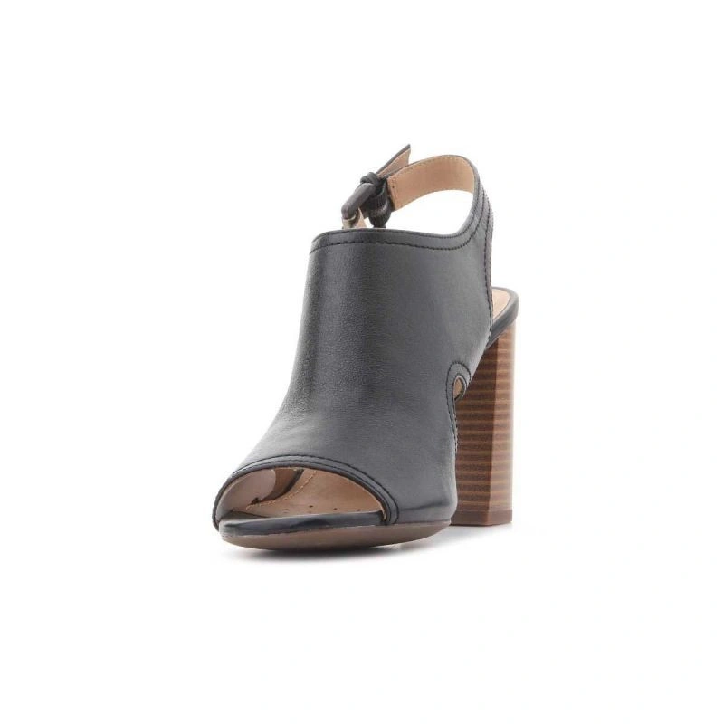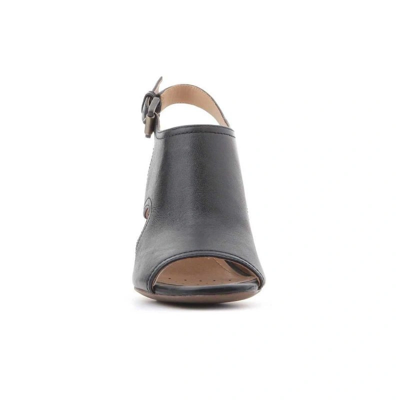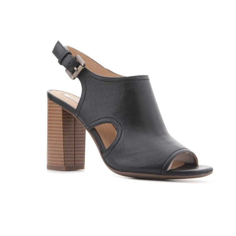 Dámská obuv z černé kůže na vysokém 9 cm podpatku. Svršek je na nártu vysoký. Na boku kovová přezka pro nastavení pásku na patě. Stylová elegance! Technologie Geox Respira - patentovaná perforovaná podrážka obuvi, postavená na mikroporézní membráně, která absorbuje a odvádí pot, aniž by do boty pronikala voda.