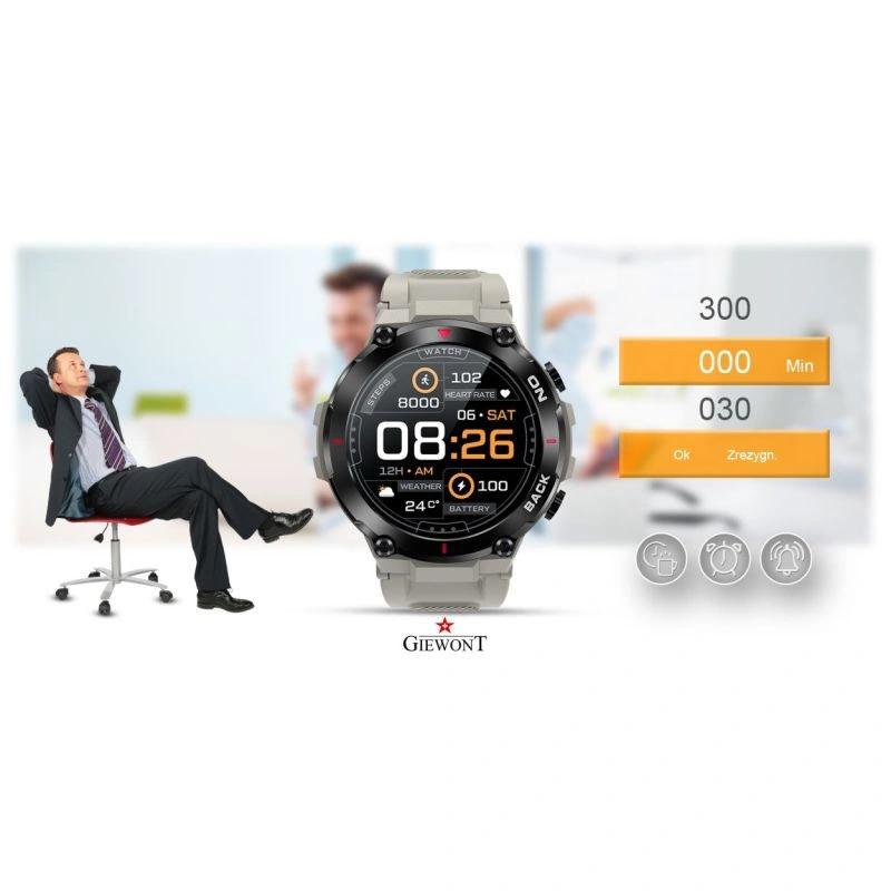 ať vám nic nestojí v cestě k dosažení vašich každodenních cílů! Hodinky Giewont GW460 vám pomohou kontrolovat vaše zdraví a kondici - v aplikaci si můžete nastavit, v jakém časovém intervalu vám má zařízení připomínat, že si máte sednout a hydratovat se.
