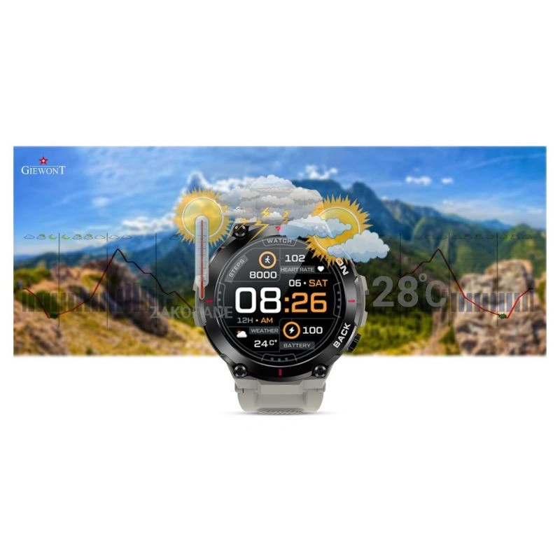 Tento model hodinek Giewont navíc po propojení s aplikací zobrazuje údaje o počasí. Nyní tedy můžete svou aktivitu přizpůsobit povětrnostním podmínkám a užít si procházku nebo trénink za slunečného i deštivého počasí.
