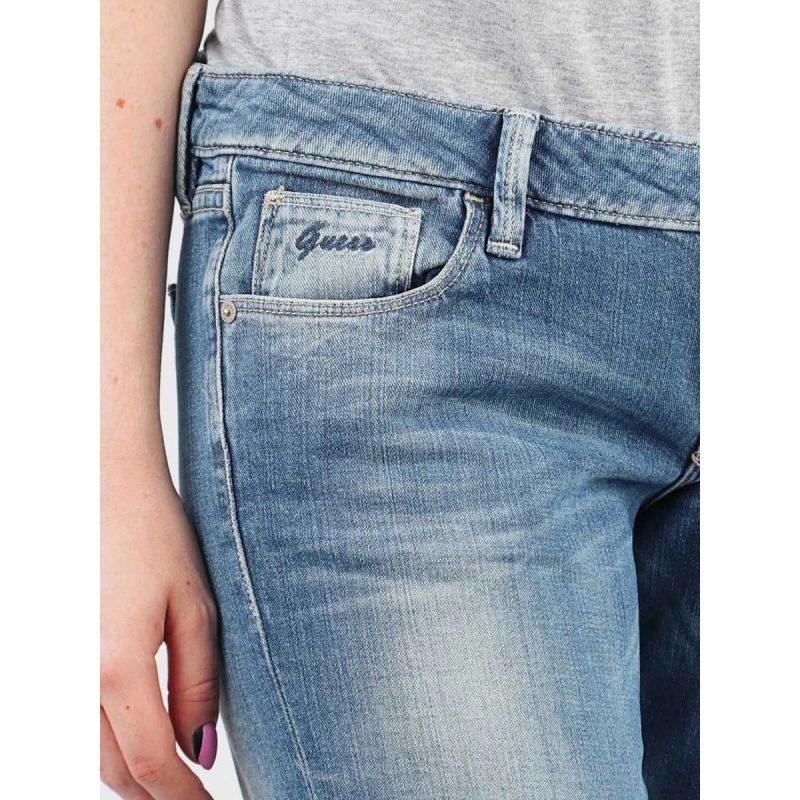 Dámské jeansové kalhoty nízkého regular střihu se zúženými nohavicemi, zapínáním na zip a knoflík, s výraznou kovovou značkou Guess na zadní kapse.